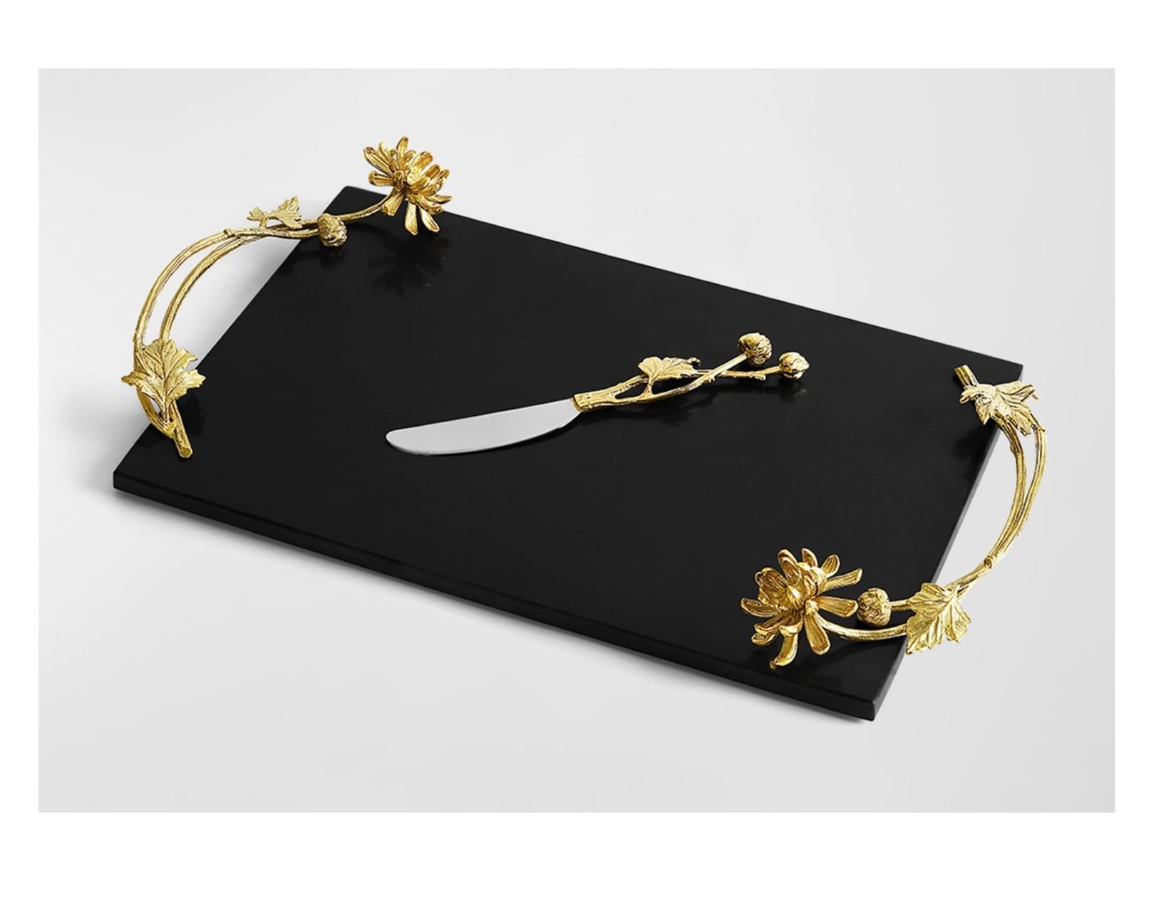The Dahlia collection captures a sense of romance, intricacy and opulence. The beautiful contrast of the radiant golden bloom design against black granite and enameled gold plated stainless steel, evokes a mysterious sensuality. This lovely set includes a 17x10" cheese board and knife crafted of brass, black kadappa and stainless steel. Also included is a small Dahlia serving bowl crafted of stainless steel and brass trim measuring 5"Hx6.2"D. DALLAS SAFARI CLUB THANKS JOHN & PAM PATTERSON FOR THIS 100% DONATION. John & Pam Patterson, pnpatterson3@yahoo.com.