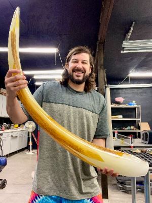 Garmezy Glass has donated a Hot Sculpted Glass Sculpture titled Glass Ivory by Grant Garmezy. This piece features a hot sculpted glass Beautiful one of a kind hot sculpted glass elephant tusk with pure 24k gold and silver leaf with a hand forged steel stand. Grant Garmezy's artistic journey has led him to embrace the sculptural essence of glass rather than its functional aspects. Employing specialized tools, precise timing, and the forces of gravity, Grant expertly shapes the molten glass, which remains in constant motion at temperatures exceeding two thousand degrees. His work, focused on animal imagery and natural forms, has evolved from capturing physical features to conveying expressions and movement that transform each piece into a narrative. In a glass studio, a symphony of artistry and craftsmanship unfolds as a team orchestrates the creation of one-of-a-kind pieces amidst the searing heat of 2,300 degrees. The fundamental equipment includes a furnace for melting glass, a reheating chamber for maintaining malleability, and an annealer for gradual cooling. Grant's technique, known as hot sculpting or "off-hand" sculpting, involves shaping the glass directly by hand, aided by an intensely hot torch and an assortment of manual tools. Every piece is an individual masterpiece, free from molds, and the collaborative efforts of a skilled team ensure its realization. The Glass Ivory sculpture embodies the fusion of skill, vision, and teamwork that defines the world of glass artistry. For more information contact Grant Garmezy by phone at (615) 476-3337 or by email at grantgarmezyglass@gmail.com. Company website: www.grantgarmezyglass.com