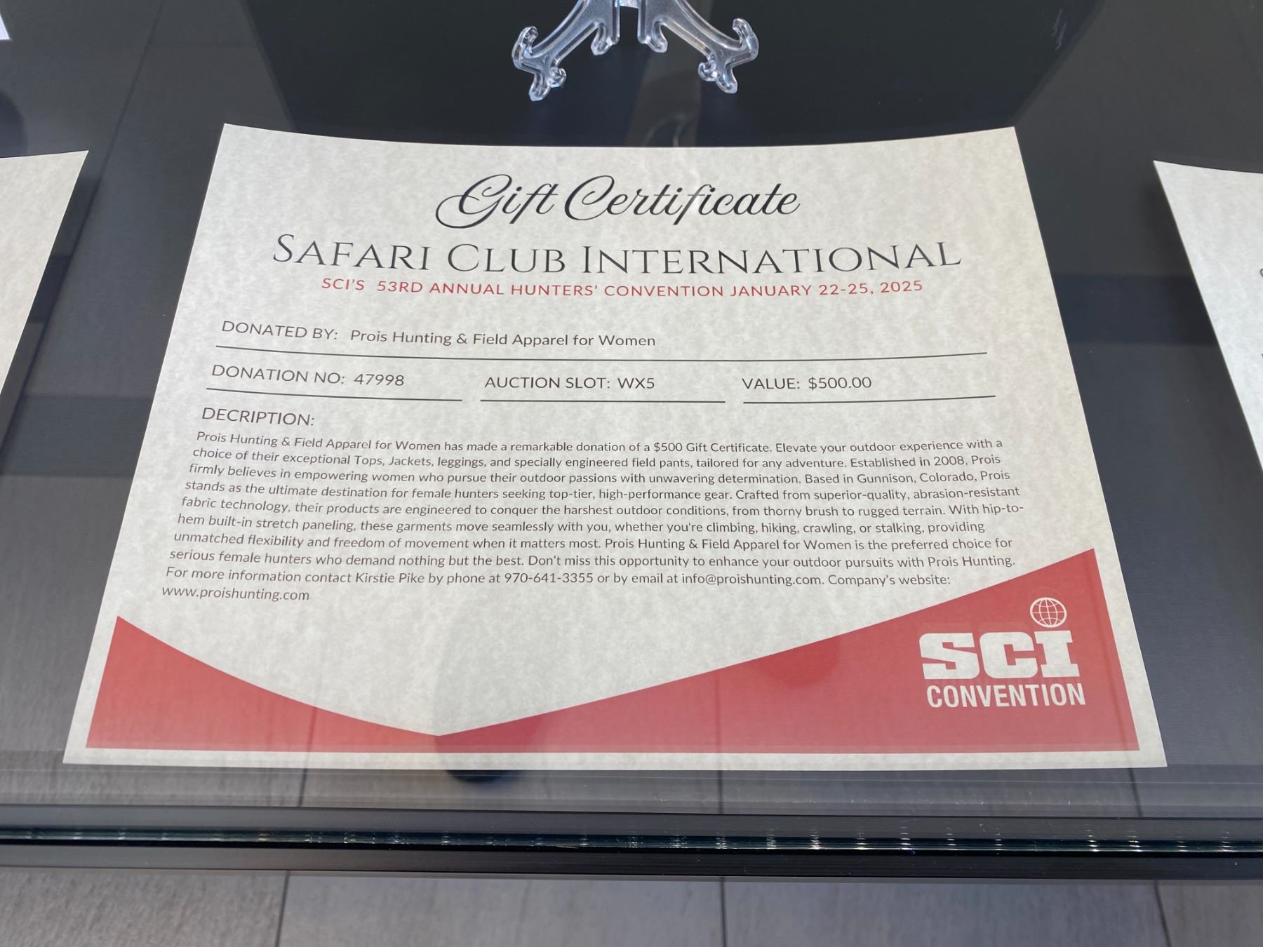 Lot 5WX $500 Gift Certificate to Prois Hunting & Field Apparel for Women