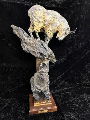 Kronenberg & McKellar Art presents "Neighborhood Watch," a captivating bronze sculpture that embodies the vigilant spirit of a mountain goat as it surveys its rugged terrain. Standing 37" tall, with a width of 23" and a depth of 8", this piece masterfully captures the essence of wildlife in its natural habitat. The detailed textures and lifelike presence of the mountain goat poised on rocky outcrops make this sculpture a striking addition to any art collection. For more information, contact Joe Kronenberg by phone at (208) 659-0469 or by email Joe@Kronenbergart.com. Company's website: www.jerrymckellar.com