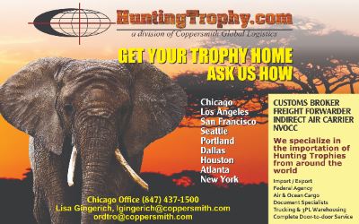 Coppersmith Inc. has generously donated a Full-Service Customs Clearance Import Package tailored to facilitate the smooth clearance of your hunting trophies. With over three decades of expertise in clearing hunting trophies, Coppersmith stands as a reliable customs broker. Their extensive knowledge and licensing enable them to represent individuals and businesses in the clearance process to the U.S., particularly concerning the regulations and agencies involved, including US Customs, USDA, and US Fish & Wildlife Service. They meticulously handle all details, from the hunter's personal information to the origin, quantity, and species of trophies, as well as final delivery, ensuring compliance with regulations. Coppersmith works with the Government agencies to assist their inspections for diseases or insects harmful to public health or agriculture, and that all permits and paperwork for endangered species are in order. With nine offices across the country, including USDA Approved Warehouses in Dallas and Chicago, Coppersmith offers efficient clearance services at major ports of entry. Whether delivering your trophies to your taxidermist for finishing or directly to your home or office, Coppersmith ensures a hassle-free experience for hunters. Does not include overseas shipping, airport transfer, terminal handling/cargo import service charge, airline storge charges, USDA & FWS exam, CDC permit, and inspection fee; see donor for additional information. For more information contact, Lisa Gingerich by phone at (847) 437-1500 or by email at lgingerich@coppersmith.com. Company website: www.Huntingtrophy.com