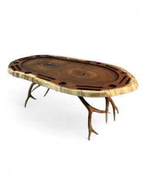 Lake AntlerWorks has generously donated a stunning Live Edge Wood Parota and Elk Antler Poker Table, expertly crafted by the award-winning artist Joseph Lake. This unique table, seating up to 8 players, is a testament to Joe Lake's meticulous craftsmanship and artistic vision. The table features a solid parota wood top, harmoniously integrated with naturally shed elk antlers, creating a piece that is both functional and artistically captivating. Measuring 76" long, 48" wide, and 30" tall, and weighing approximately 300 lbs, this poker table is designed to be a centerpiece in any game room. For more information, contact Joseph Lake by email at lakeantlers@gmail.com or by phone at 307-359-8804. Company's website: www.lakeantlerworks.com