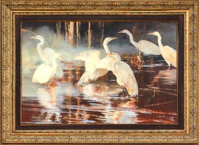 Call of Africa Galleries has donated a beautifully framed limited edition giclee on canvas titled "Symphony" by renowned wildlife artist Shirley Greene. This exquisite piece, numbered 32/99, captures the serene beauty of egrets bathing. Shirley Greene is celebrated for her masterful depictions of wildlife, and this giclee exemplifies her ability to portray the elegance and tranquility of nature. The artwork measures 24 x 36 inches, and with the frame, it measures 33 1/4 x 45 1/4 inches, making it a striking addition to any collection. For more information, contact Ross Parker at 954-445-8252 or by email at callofafricawarehouse@yahoo.com. Company's website: www.callofafrica.com.