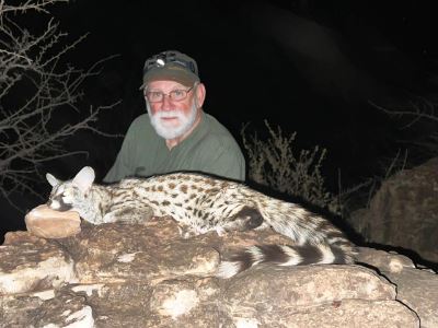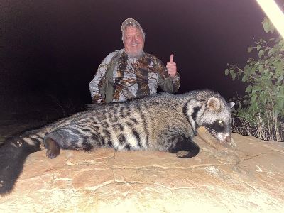 This 10-day, South African 1x1 guided hunt for Kudu, African Wild Cat, Honey Badger, Civet and Genet Cat for one hunter and one non-hunter is donated by Fanie Steyn of Thaba Mmoyo Safaris. Method of take is rifle. Schedule hunt with outfitter July-November 2025 or 2026. For the species collecting hunter, no collection is complete without the audacious small predators of Africa. This is the most challenging collection of animals to pursue in Africa. Transportation during the hunt is by vehicle; the small predator hunts are done by baiting, lamping and predator calling. Included are meals, airport transfers from Polokwane, deluxe thatched-roof accommodations, 1x1 guided service, trophy fees for donated animals and field prep. Additional plains game hunters are welcome for $450 per day plus trophy fees and non-hunters for $195 per day. Hunt for small predators may be extended at $450 per day or upgraded to include other small predators, and plains game. Dangerous game hunts are available; consult with outfitter for details. Not included are accommodations before/after hunt, firearm permits, dipping/packing and shipping and gratuities. Arrival/departure point is Polokwane Airport. For more information, contact Liandra by email at info@thabammoyo.co.za or by phone at Int. 27832280404. Company's website: www.thabammoyo.co.za