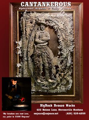 C.M. "Chip" Jones-Big Rock Bronze Works has generously donated an exquisite original, titled "Cantankerous," a captivating Splashed Bronze High Relief Sculpture, part of a limited series of 9. This unique work of art showcases Chip Jones' exceptional talent and innovative technique, developed over fifteen years ago. Using cast iron ladles, Chip ingeniously throws, drips, and splashes molten metals to create this one-of-a-kind relief sculpture, a method unparalleled in the world. He passionately describes his process as using "cast iron brushes" and "painting at 2300 degrees." Chip's remarkable artistry has earned him recognition worldwide, with his works gracing galleries, museums, and private collections in all 50 states. For more information, contact Chip Jones at 406-626-4696 or by email at bigrockbronze@gmail.com. Company's website: www.bigrockbronze.com.