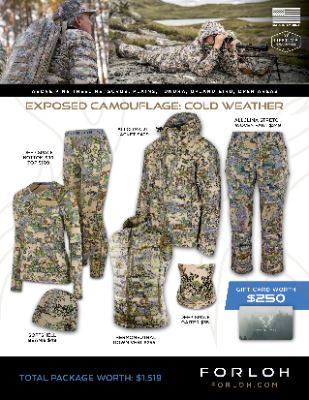 Introducing the ultimate exposed camouflage cold-weather package from FORLOH, designed for the adventurer who seeks to explore beyond the beaten path. This comprehensive bundle, includes the AllClima 3L Jacket and AllClima Stretch Woven Pant, offering exceptional protection and flexibility in extreme conditions. The Deep Space Bottom and Top layers provide essential insulation, while the ThermoNeutral Down Vest adds a versatile mid-layer for additional warmth. Complementing the outfit are the Softshell Beanie and Deep Space Gaiter, ensuring you stay warm from head to toe. Additionally, a $250 gift card allows you to further personalize your outdoor gear collection. FORLOH's commitment to innovation and American-made quality ensures that you are well-equipped for any adventure, whether you're hunting, exploring new terrain, or seeking the ultimate outdoor experience. For more information, please contact Lisa Ward by phone at (929)244-3477 or by email at lisa.ward@forloh.com. Visit the company's website at www.forloh.com