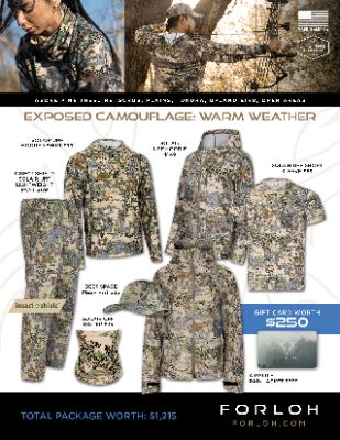Presenting the exposed camouflage warm-weather package from FORLOH, expertly designed for those who venture into the wild during the warmer months. This versatile bundle, includes the Solair UPF Hooded Shirt and Solair UPF Hoodie, providing sun protection and comfort in hot climates. The lightweight Solair UPF Pant and Short Sleeve Shirt ensure you stay cool while remaining protected, and the Insect Shield technology adds an extra layer of defense against pests. The Deep Space Mesh Hat and Solair UPF Gaiter complete the outfit, offering essential coverage for your head and neck. Additionally, the Airalite Rain Jacket is included for unexpected downpours, and a $250 gift card allows you to enhance your gear selection. FORLOH's dedication to innovation and American-made quality ensures you're prepared for any adventure, from hiking through dense forests to hunting in the open plains. For more information, please contact Lisa Ward by phone at (929)244-3477 or by email at lisa.ward@forloh.com. Visit the company's website at www.forloh.com