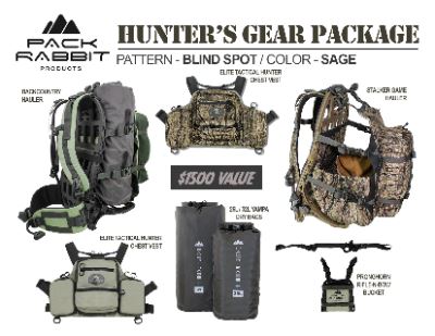 Pack Rabbit Products has generously donated the Hunter's Gear Package #1, featuring a range of essential items: Experience the ultimate in hunting gear with the Pack Rabbit Hunting Package, designed for comfort, efficiency, and durability. This package includes the Elite Tactical Hunter's Chest Vest in Blind Spot camouflage pattern, the Stalker Game Hauler Pack in Blind Spot camouflage pattern, the Elite Tactical Hunter's Chest Vest in sage, the Pronghorn Rifle-N-Bow Bucket in sage, 26L and 52L Yampa Dry Bags in Black Pearl, and the Backcountry Hauler Pack in sage. Pack your gear in and haul game out effortlessly with Pack Rabbit's patented Exo-Frame technology. For more information, contact John Addleman at jaddleman@pack-rabbit.com or call (214)774-4363. Visit www.pack-rabbit.com for additional details.