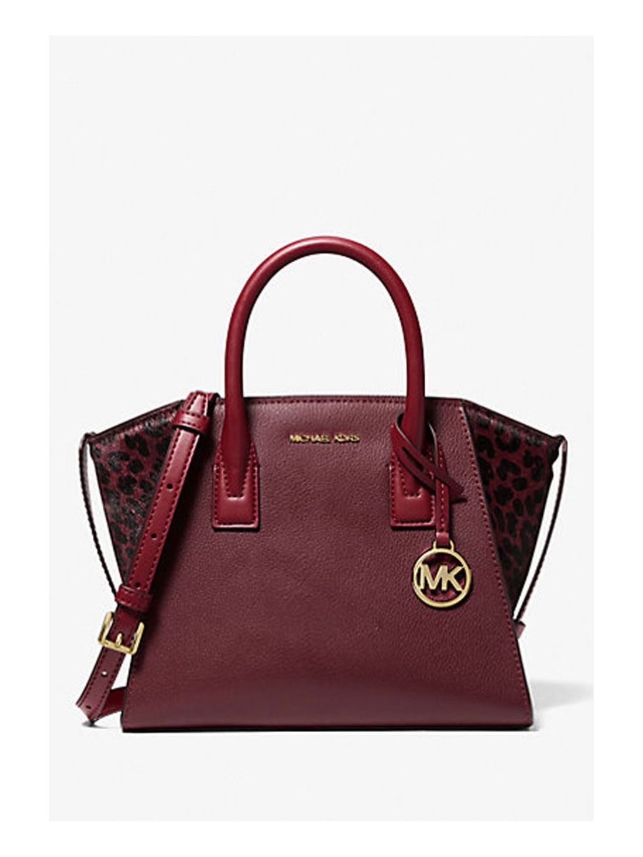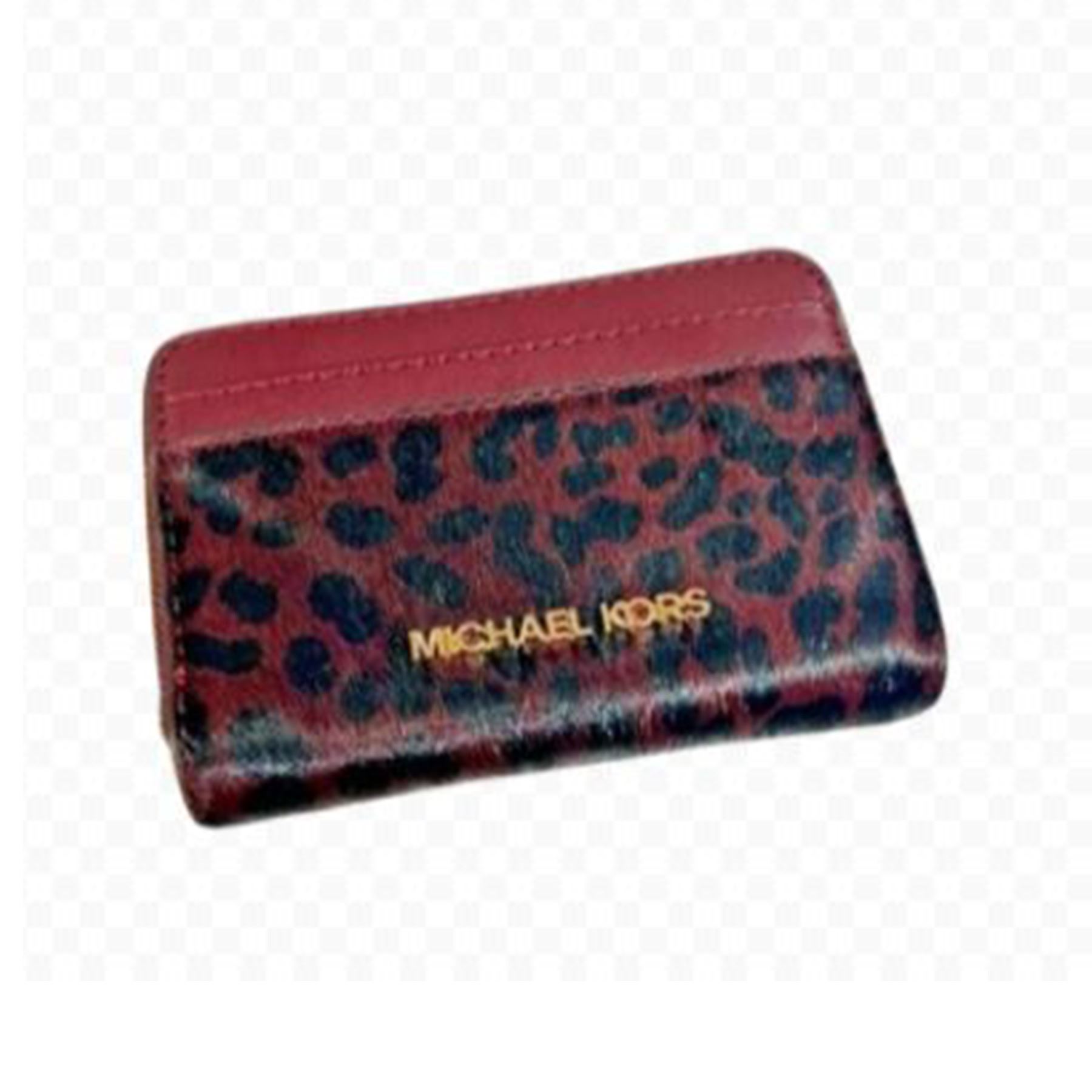 Michael Kors Avril Small Leather and Cheetah Print Calf Hair Satchel with a Michael Kors Jet Set Travel Signature Medium Zip Around Card Case Wallet (Oxblood)
