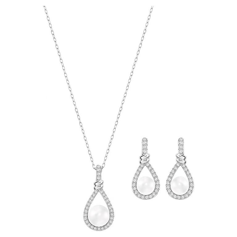 Each piece mixes a smooth, round white Crystal Pearl with sparkling clear crystal pavé and rhodium-plated metal.
