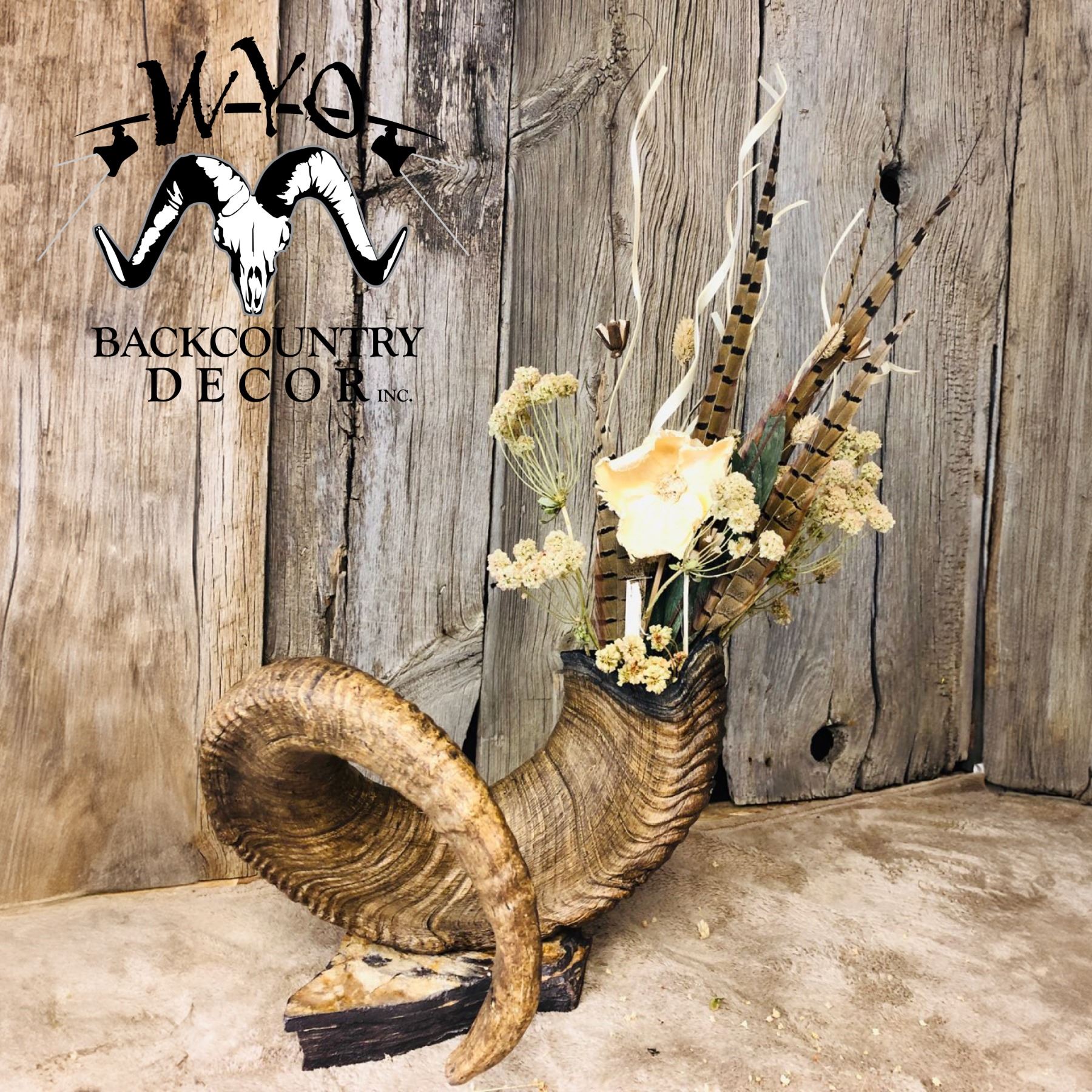 This beautiful Dall’s sheep replica horn vase with pheasant feathers and grasses would make a perfect accent or centerpiece to any home.
