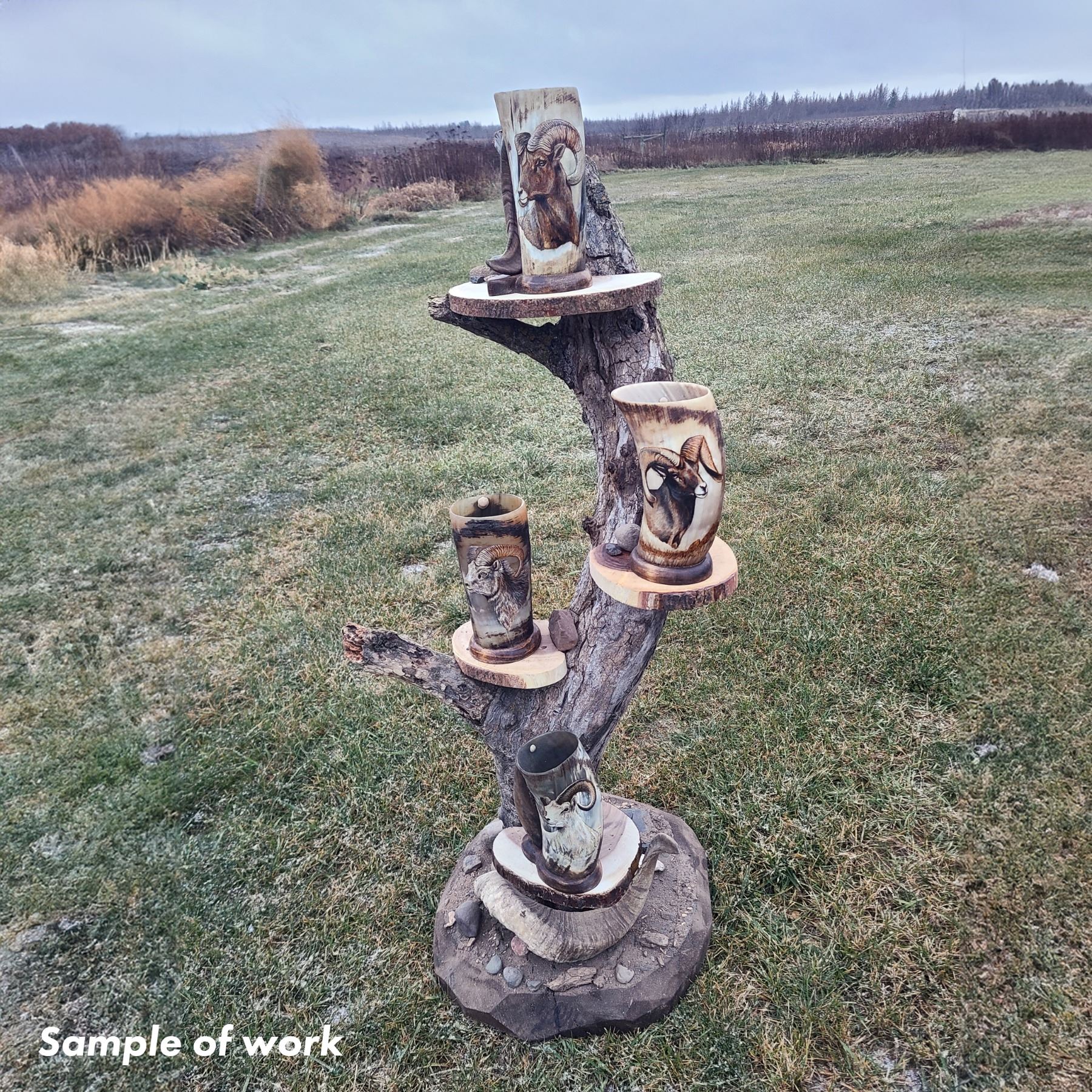 Hand-crafted custom horn mugs created from Texas longhorn horns, deer antlers, various horn handles, and wood.
