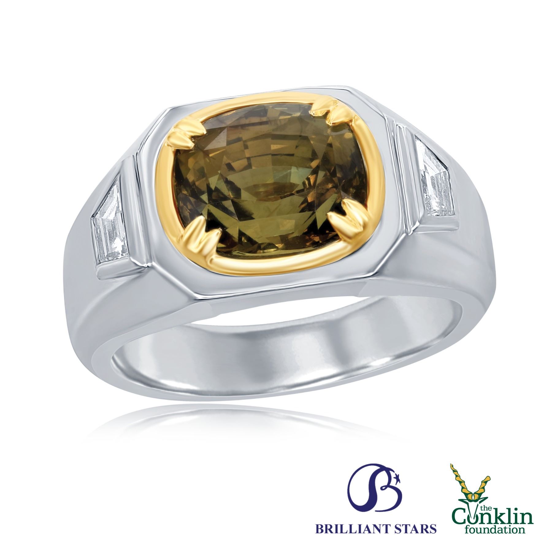 This magnificent gemstone is presented by Brilliant Stars on a handmade, contemporary ring made of 18K white gold with a yellow gold bezel, and a pair of trapezoid diamonds flanking the center stone.