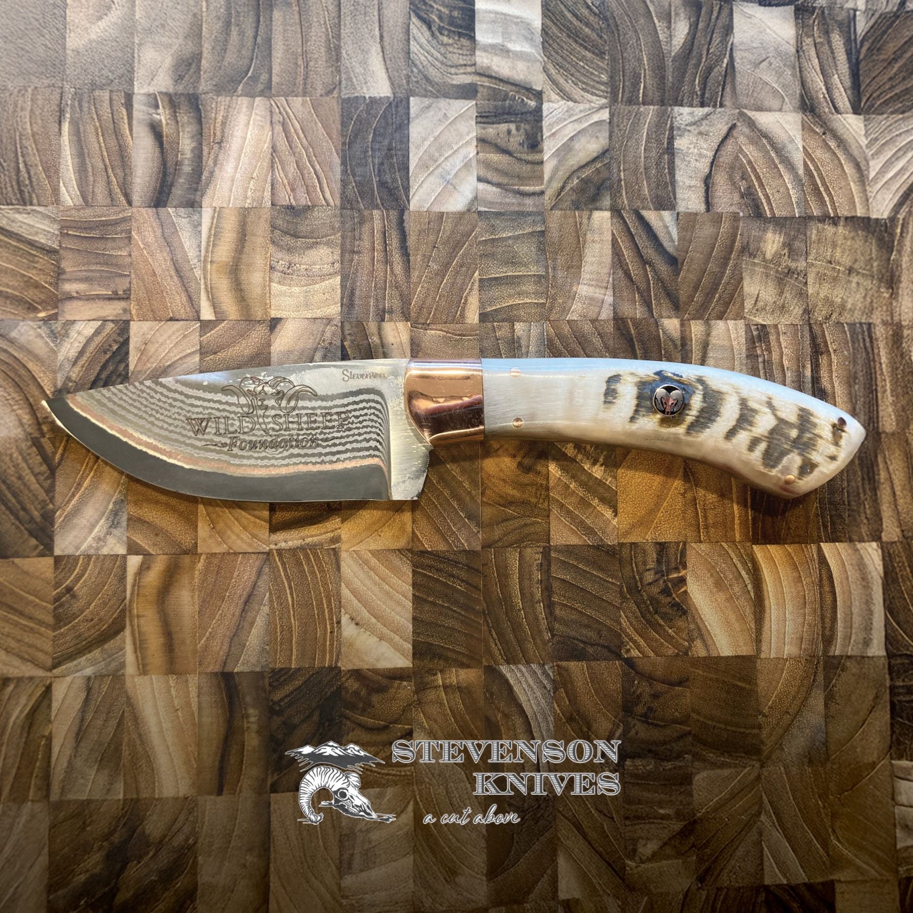 It is a beautiful Damascus knife with a sheep horn handle and sheath all adorned with the Wild Sheep Foundations logo.