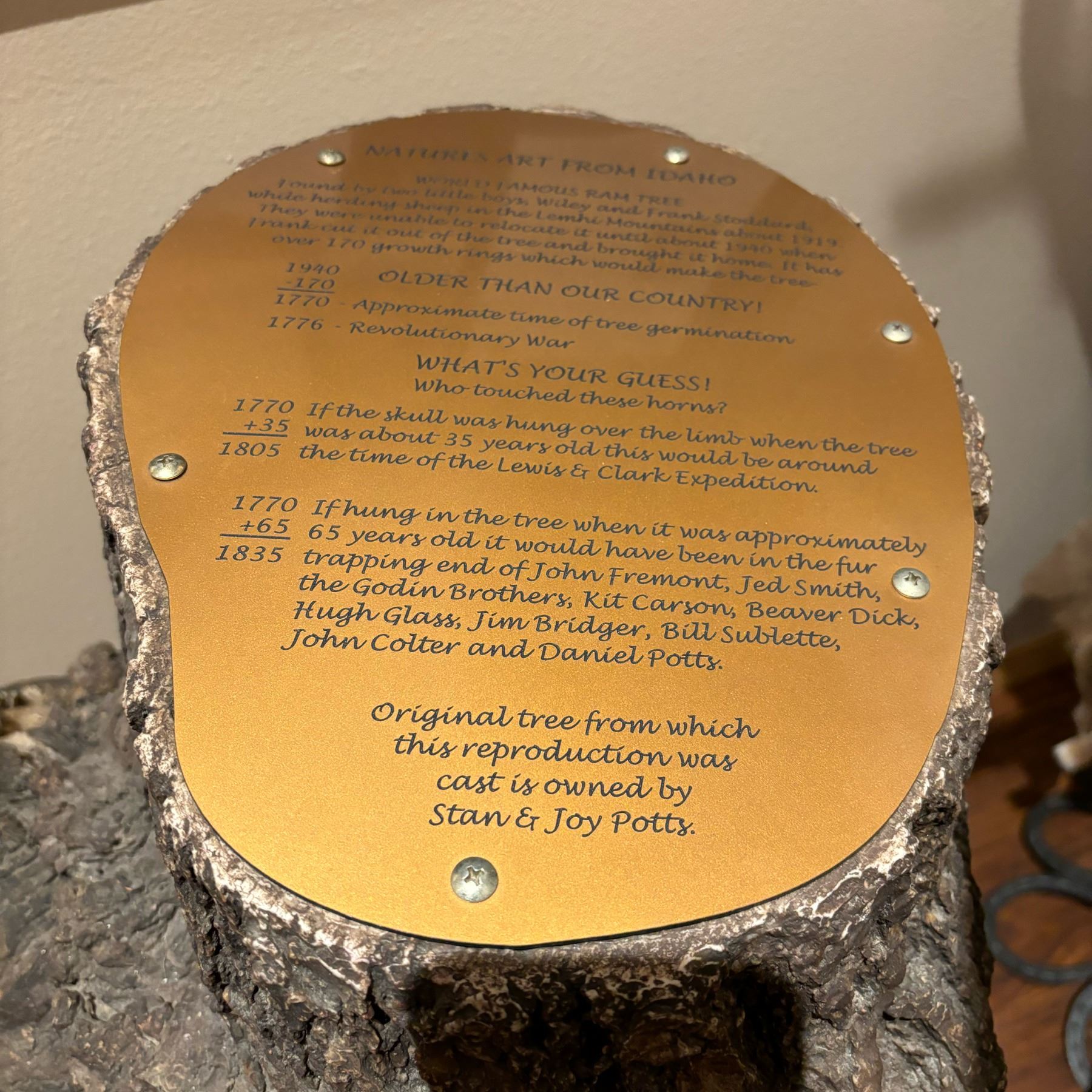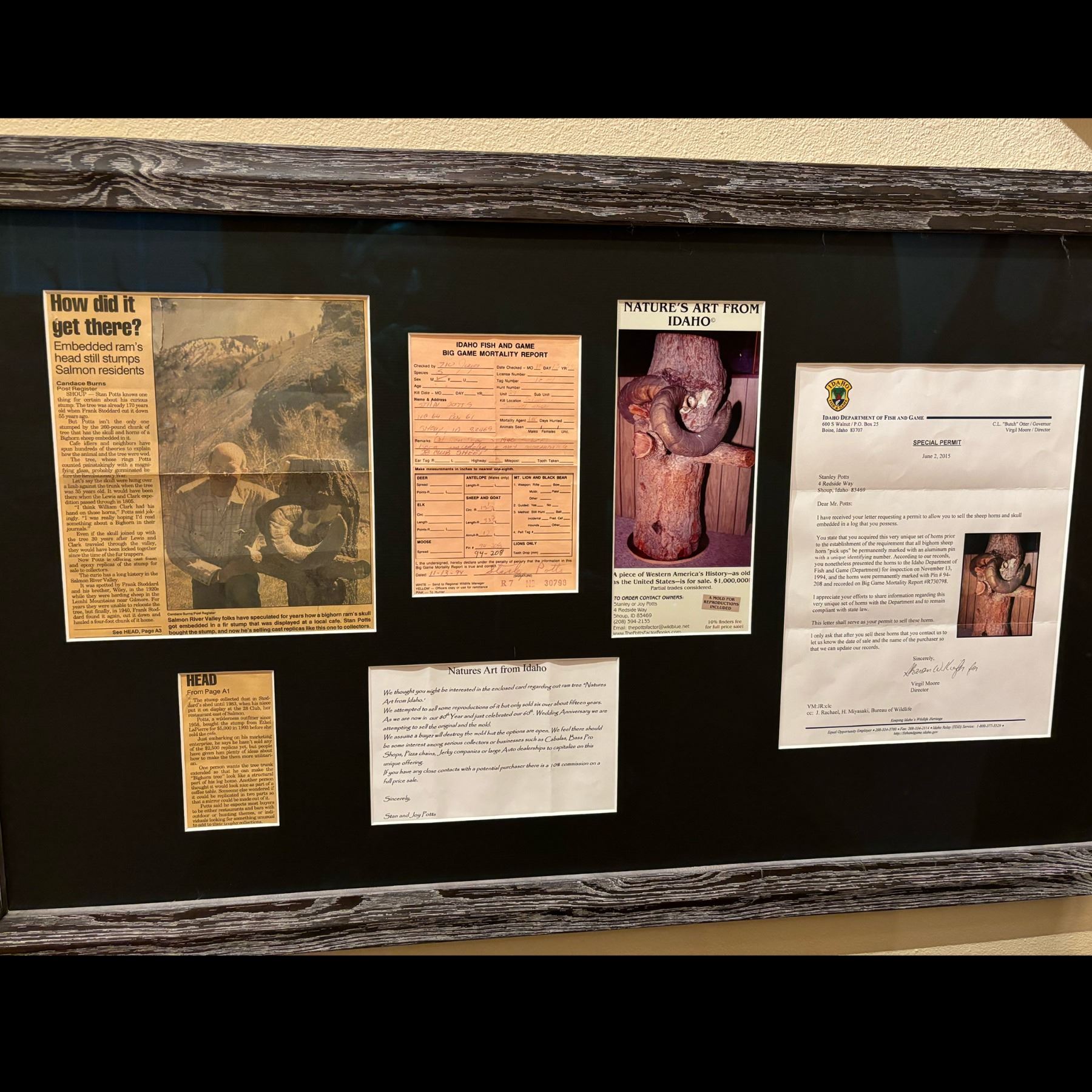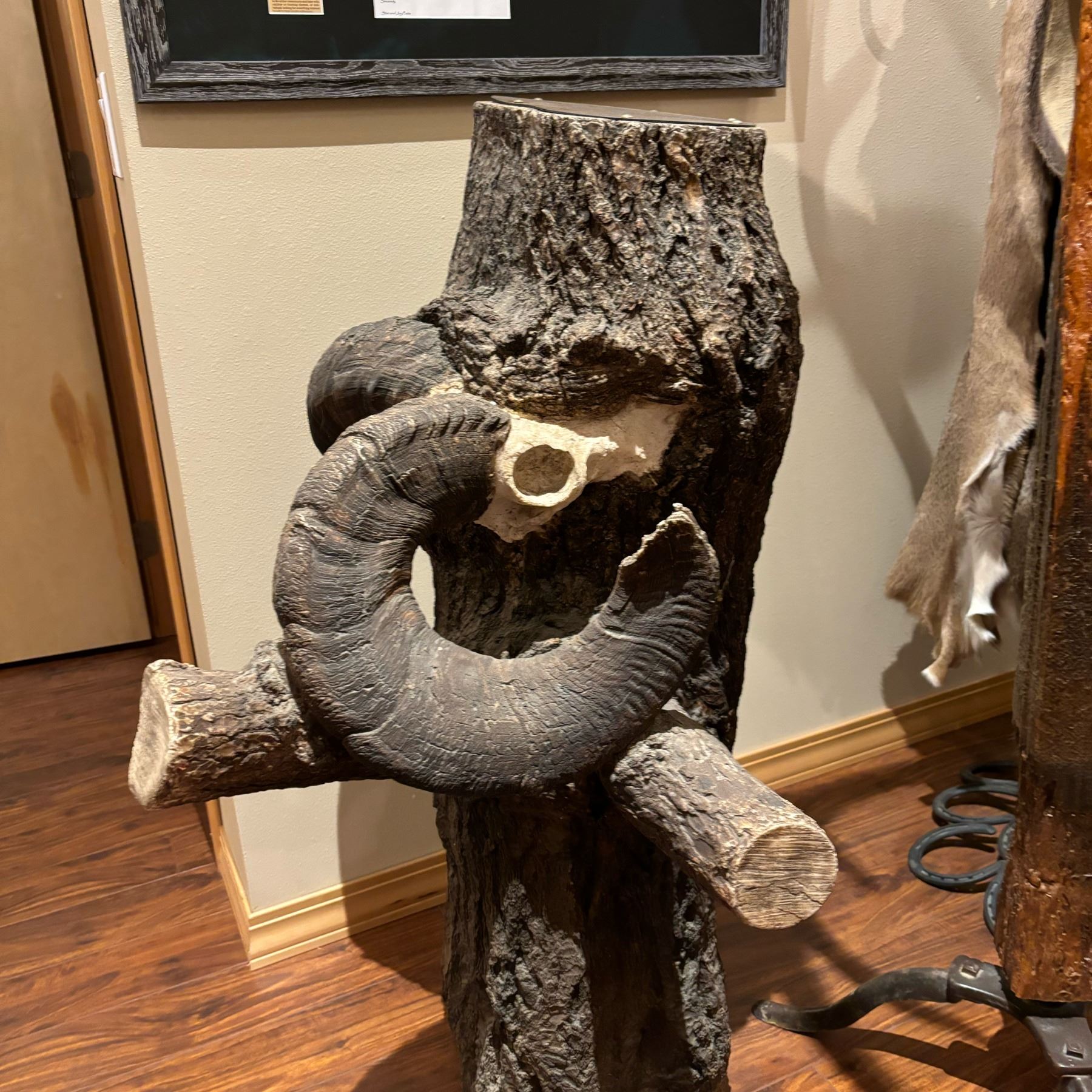 Lot 13 BIGHORN SHEEP SKULL EMBEDDED IN TREE - FOUND BY STANLEY POTTS - IDAHO
