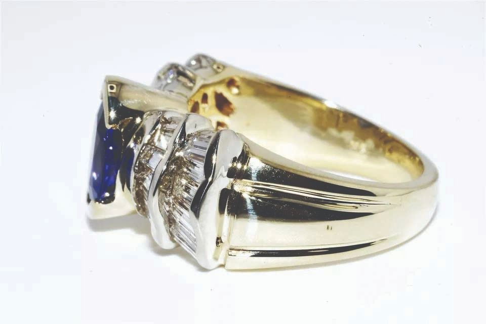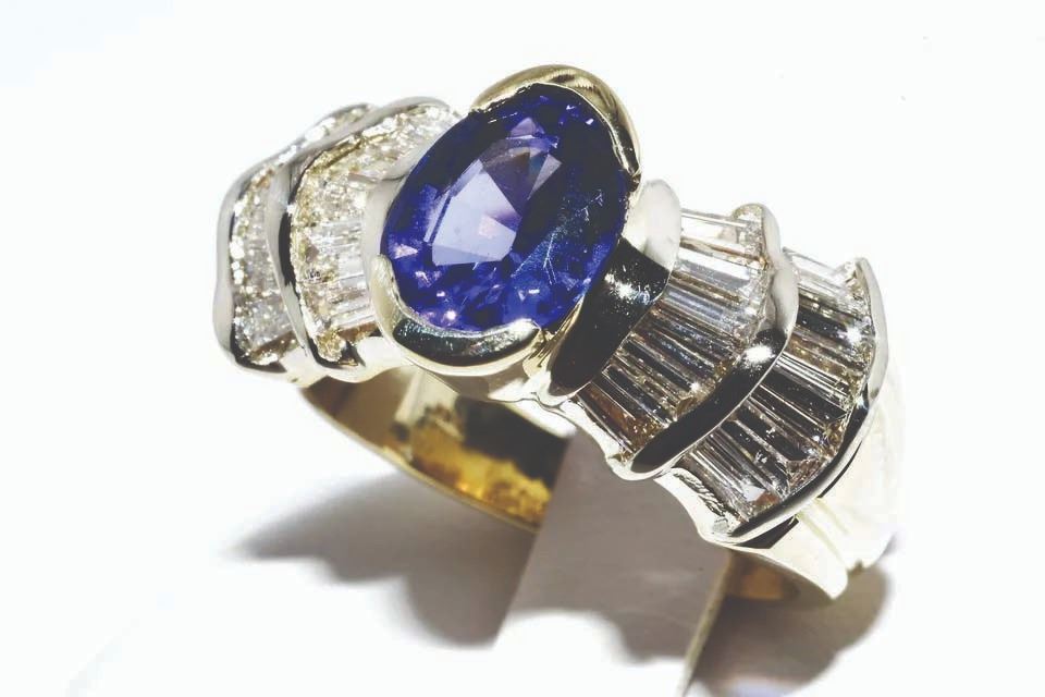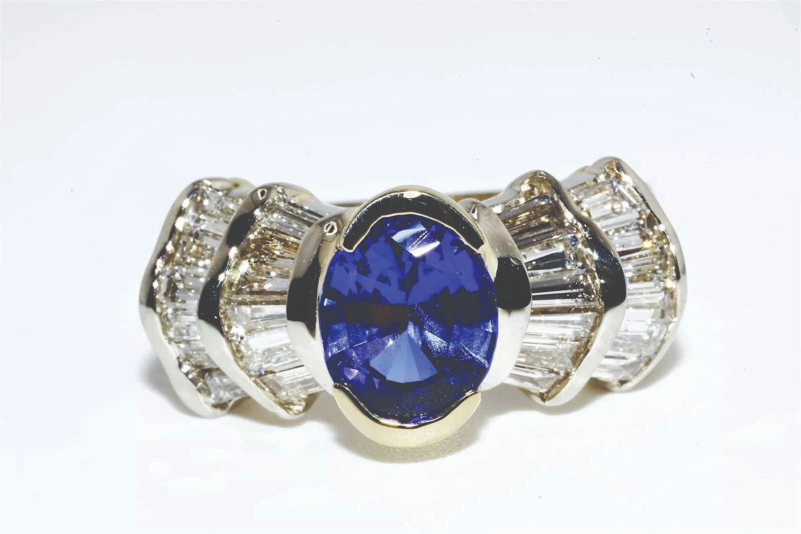 sparkling purplish-blue tanzanite center stone weighing 2.12 carats.