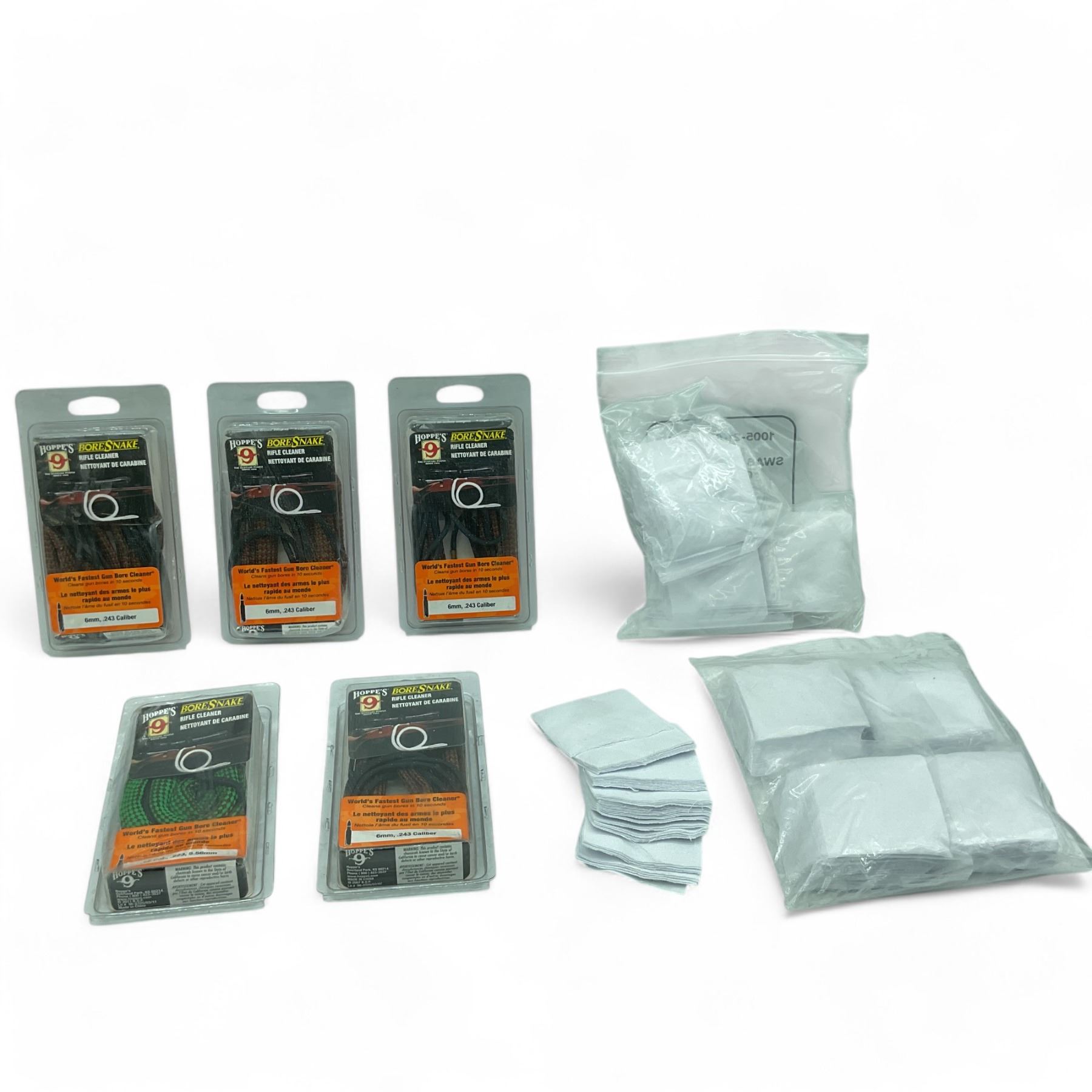 Lot 6188 Assorted Hoppe's Bore Snake Rifle Cleaner X 5 Qty and Small Arms Cleaning Swab 200 Pack X 2 Qty