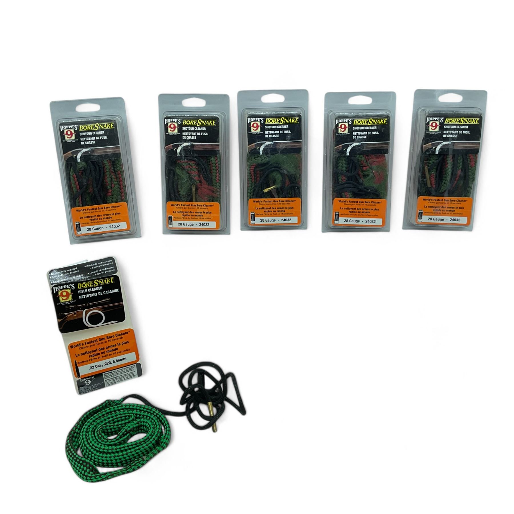 Hoppe's Boresnake 28 Ga Shotgun Cleaner X 5 Qty and Hoppe's Boresnake Cleaner for .22 cal, .223, 5.56mm Rifle X 1 Qty