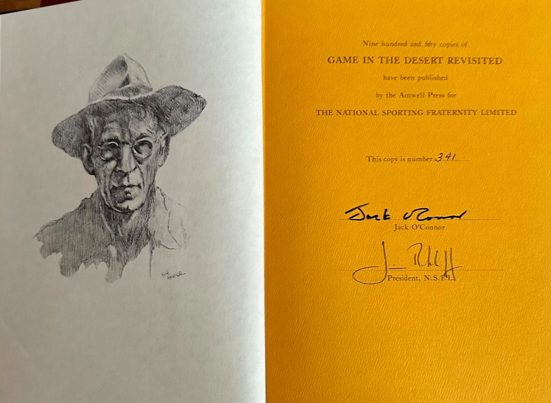 Description: (100% Fully Donated) ""Game in the Desert Revisted"" by Jack O'Connor. Hardcover. Condition: Near Fine. Dust Jacket Condition: No Dust Jacket. T.J. Harter (illustrator). First Edition. Copy number 341 of a limited edition of 950. Although not called for this copy is inscribed and signed by the author on a front endpaper . Very scarce signed in the first printing of this O'Connor classic. Green frabricoid snakeskin covers with gilt titles, color frontispiece with tissue guard and 10 plates in black and white plus 12 black and white photographs, green endpapers, bibliography, 298 pages. ""The Best of Jack O'Connor. Cloth. Condition: Good. Dust Jacket Condition: Good+. First Edition. This is a first edition number 341of 1,000 copies. The covers and spine have very light wear. Signed by the author's son. The pages are clean. Size: 4to - over 9¾"" - 12"" tall.