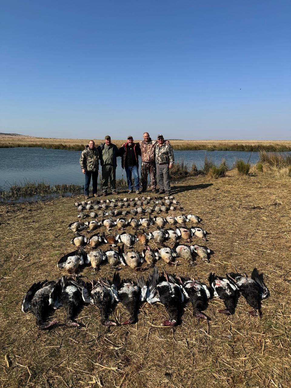 Goose shooting is done in screen blinds or lay-in blinds on reaped corn fields with a large decoy spread. The Spurwing Goose is one of the biggest in the world weighing close to 20 pounds. The hard beating sound from the wings of these huge geese is deafening when 100 or more put their landing gear out to land amongst the decoys. Expect 10 birds per gun per shoot.