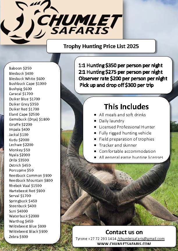 Hunt with Chumlet Safaris for a Nyala and an Impala during a 5 day free range hunt to be taken between March and December of 2025. Your hunt will take place in Kwa Zulu Naal, South Africa and you will fly into Johannesburg. Includes trophy fees, tag/license fees. We hunt the BIG 5! The hunt is for two but additonal hunters can attend for $280 per night with non hunting guests welcome at $180 per night. This is a rifle hunt and a firearm permit is required if you bring your own weapon. For other available animals, please review our price list. Check with the outfitter for dates.