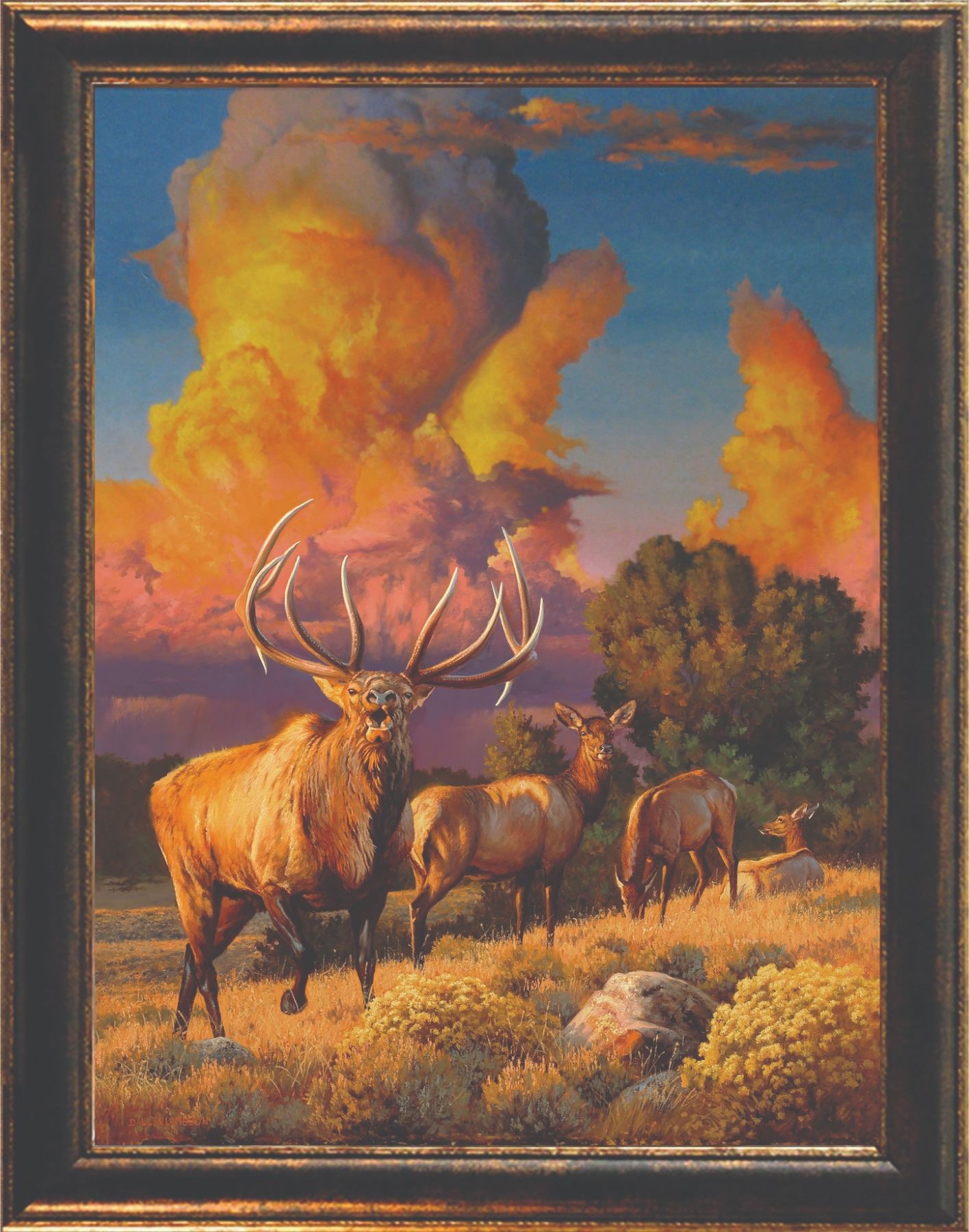 cotton canvas of a bugling bull elk with his harem of cows. In the