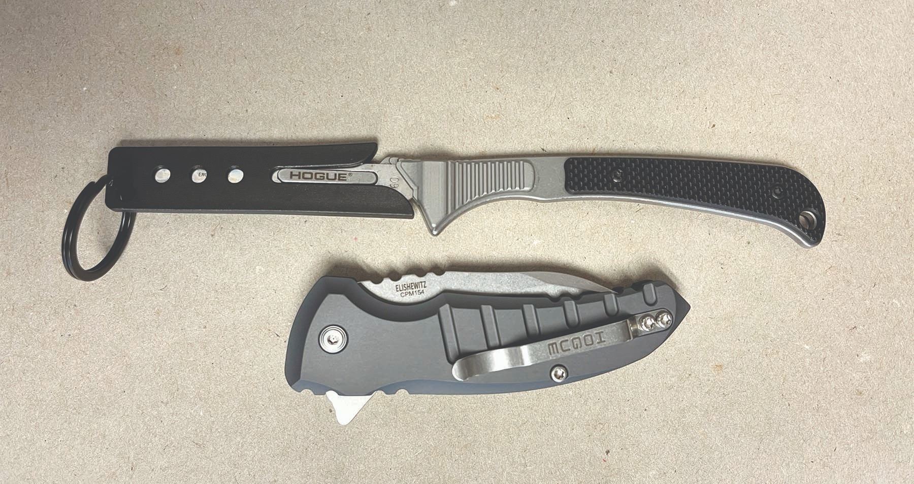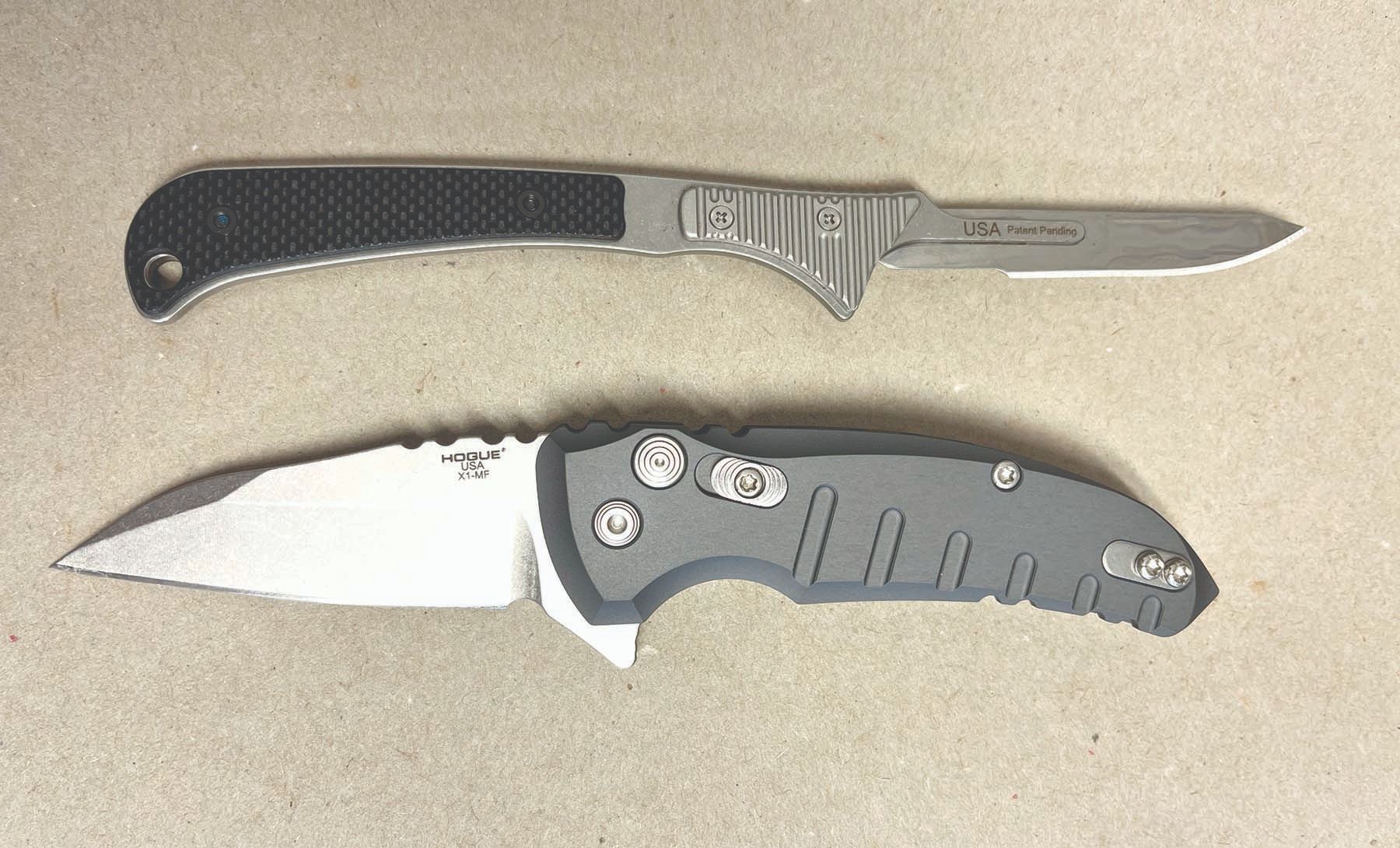 and a tumbled 440-C body in solid black, and (2) a Hogue X-1