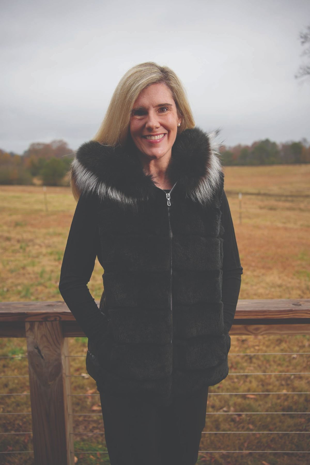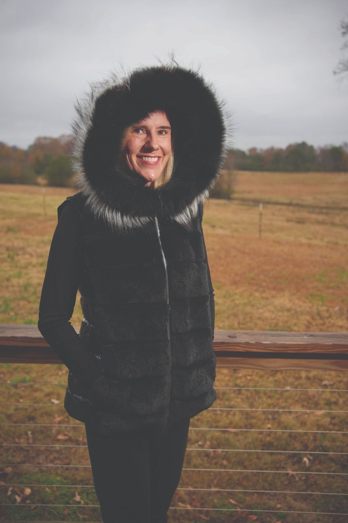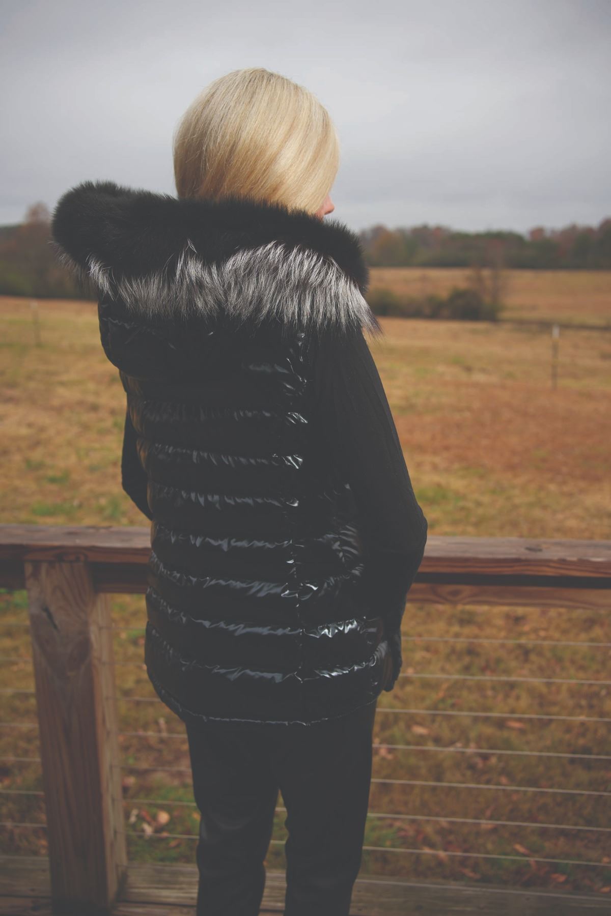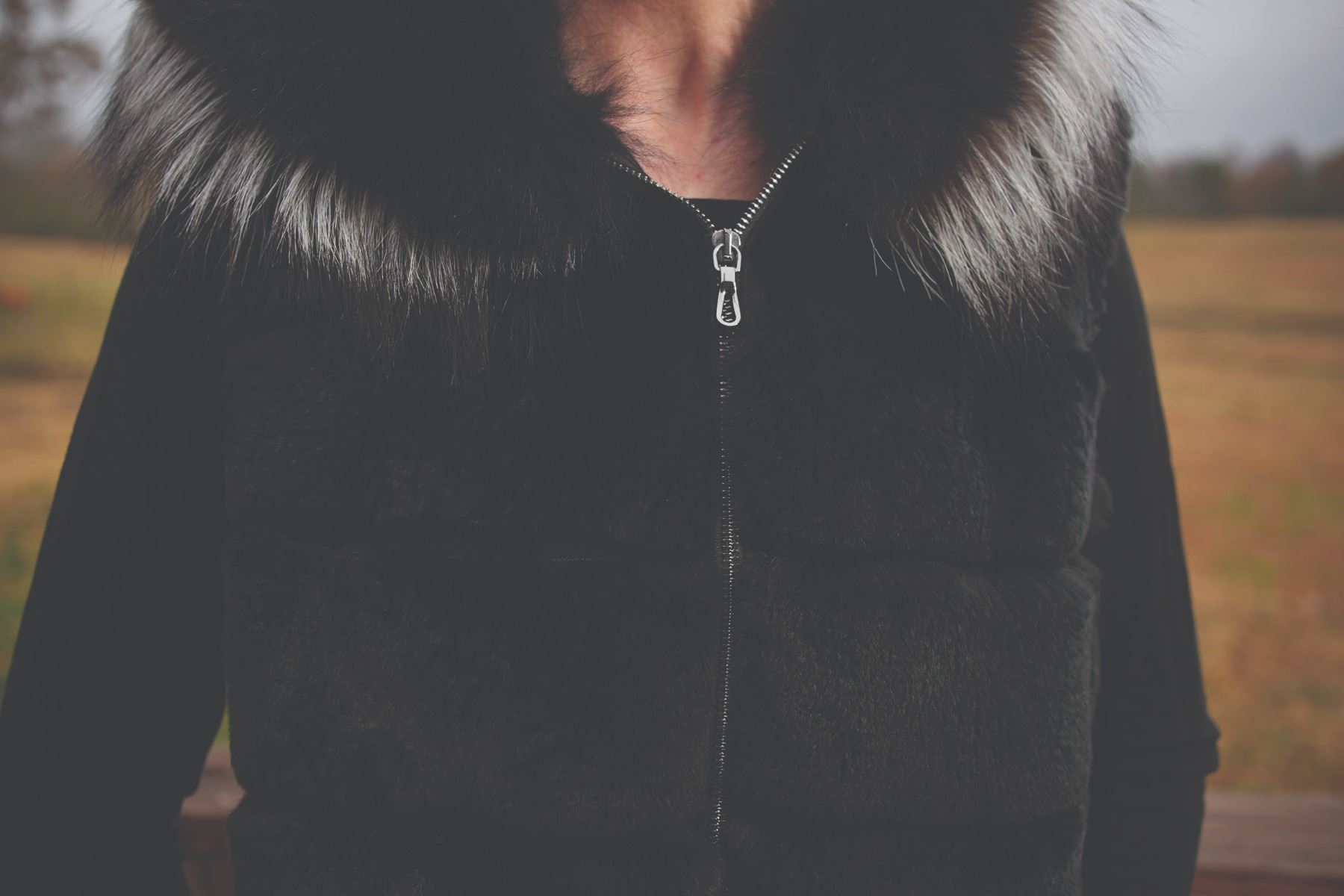 •This is a sleeveless black metallic puff vest with rex rabbit