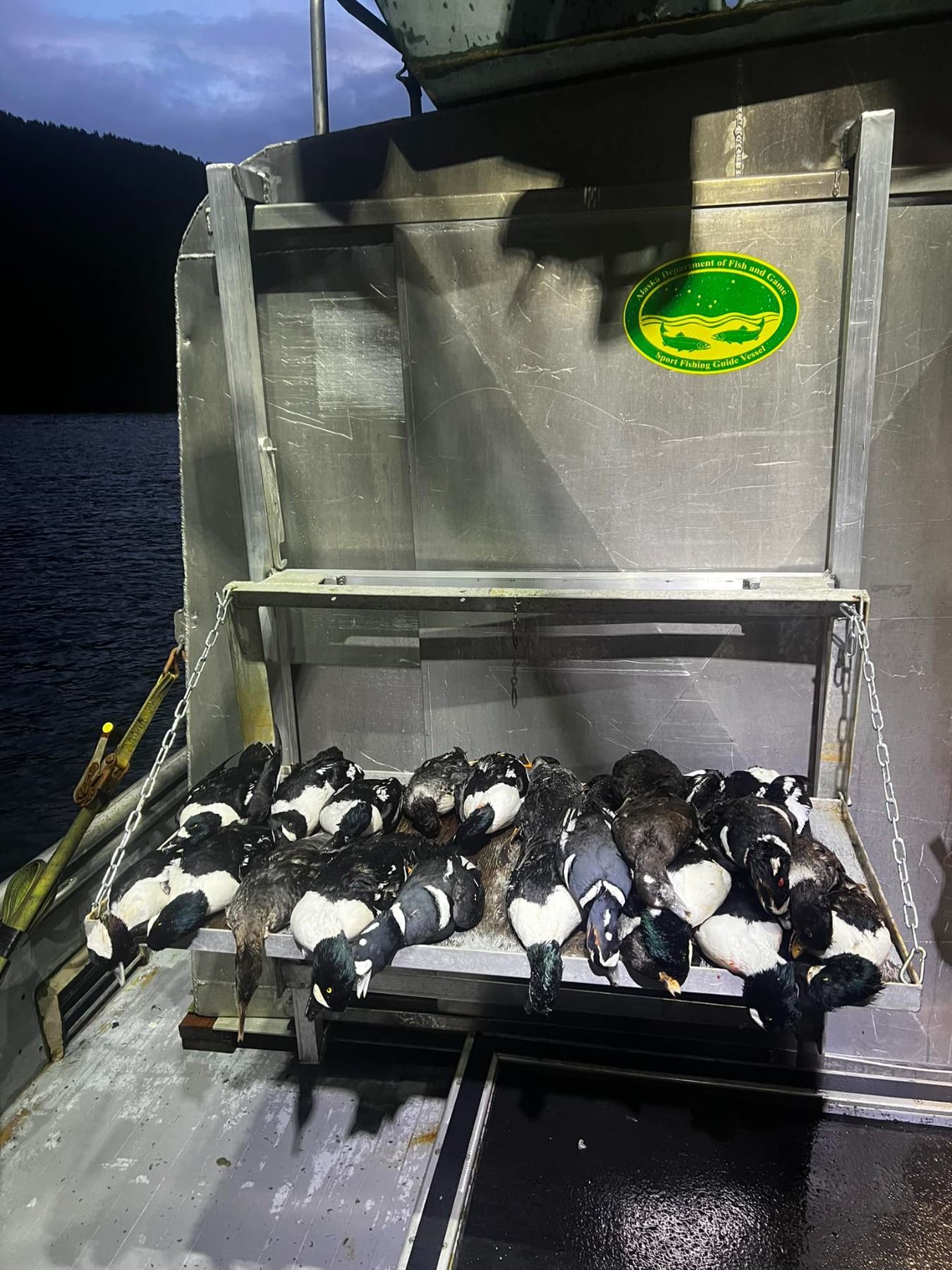 On this trip each hunter will enjoy fully guided waterfowl hunting with an annual limit of 20 sea ducks with a variety of rare and sought after species such as harlequin, Barrow's goldeneye, greater scaup, surf scoter, white winged scoter, long-tailed duck, bufflehead and more. Also enjoy guided saltwater fishing for unlimited number of pacific cod, variety of rockfish - trip limit of 6 per person (only 1 non pelagic), and up to 1 lingcod.