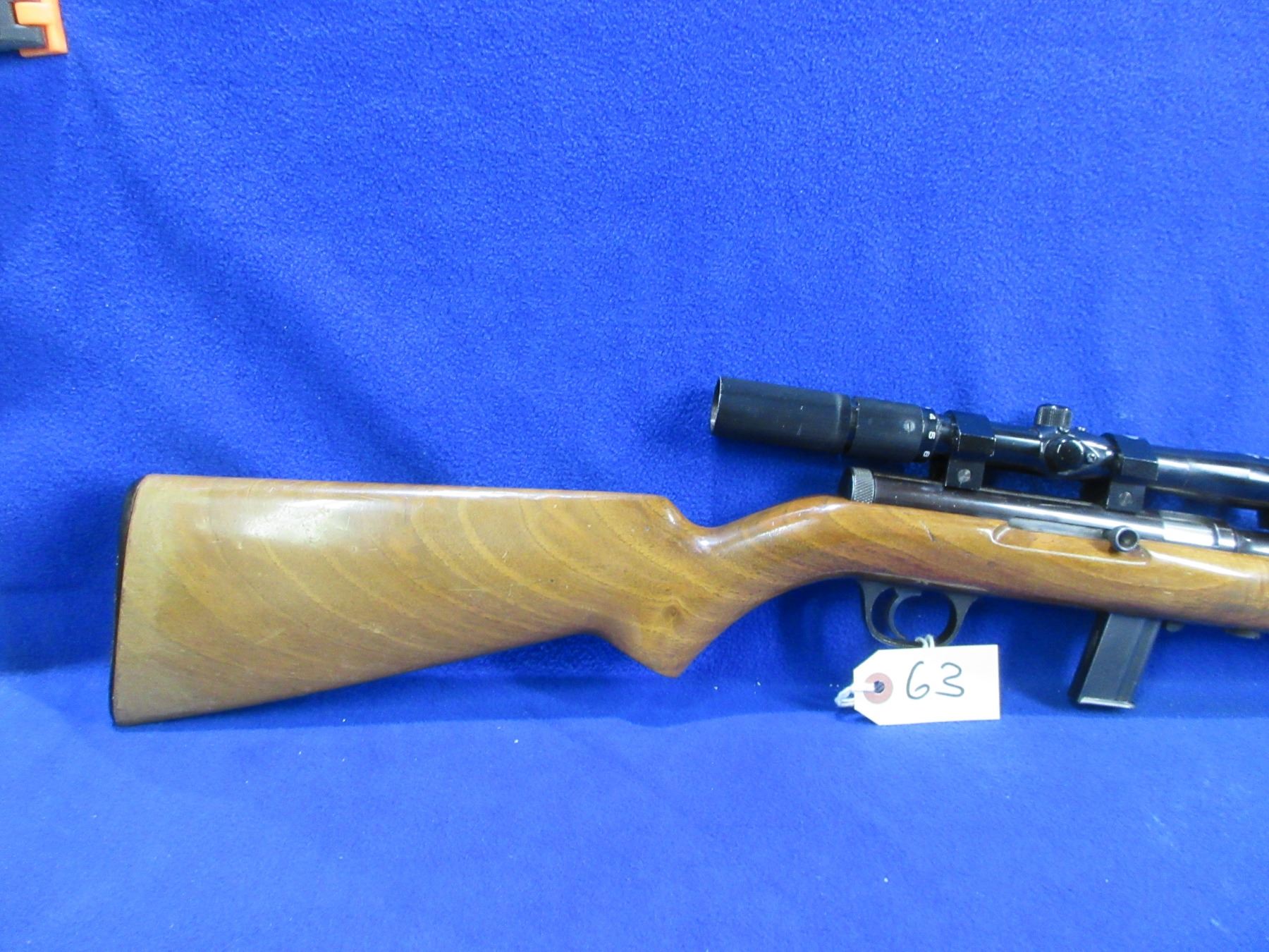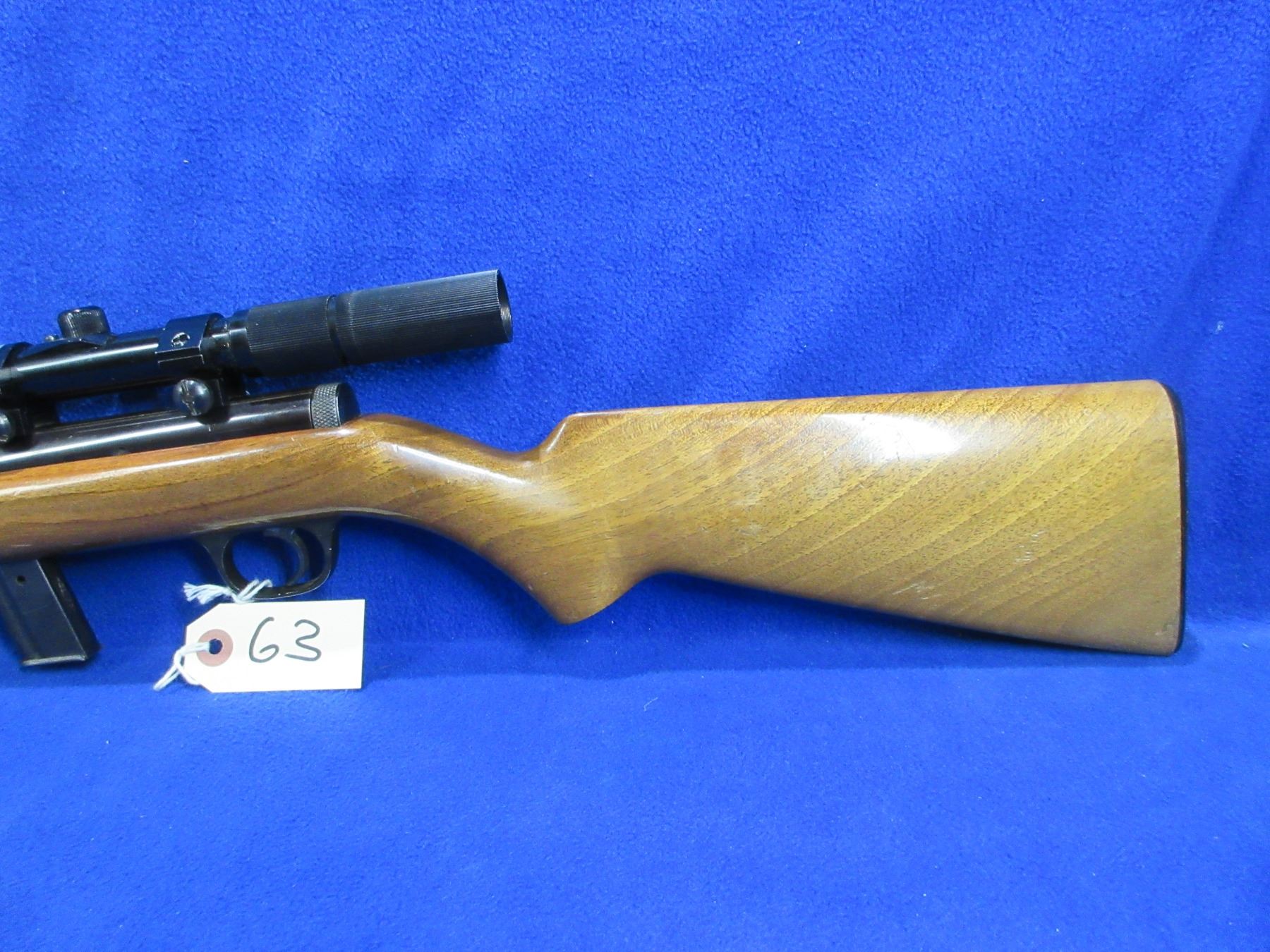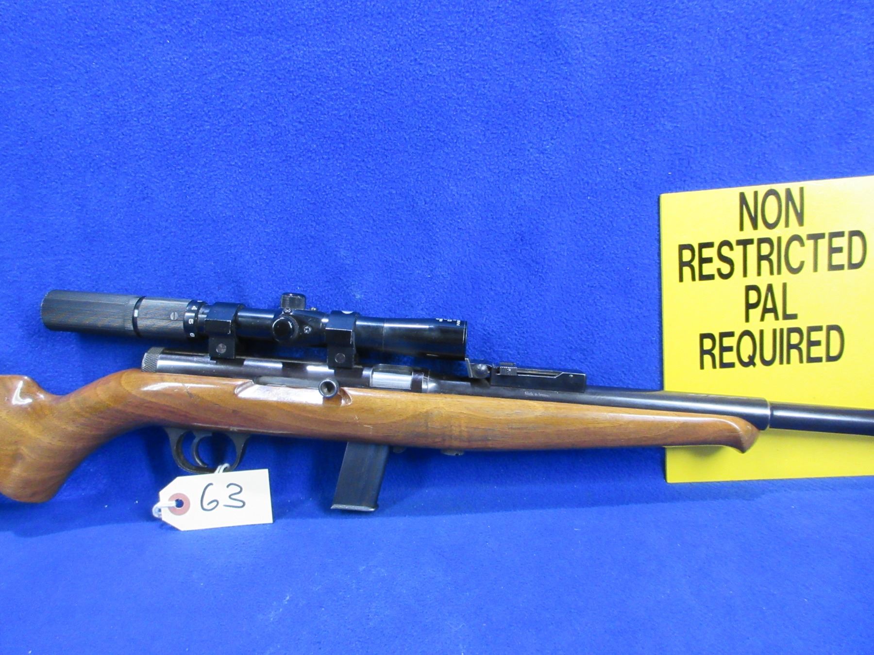 Non-Restricted - Gevarm Carbine in 22 LR - This semi-auto rifle with removable magazine appears to be in good to very good working order. Barrel is 21 5/8", rifling is very good, bluing is good to very good, has no front sight, has rear sight and Marksman 3-7x20 scope - appears clear, standard reticle. Stock is good with usage marks, butt plate good. Ser # None