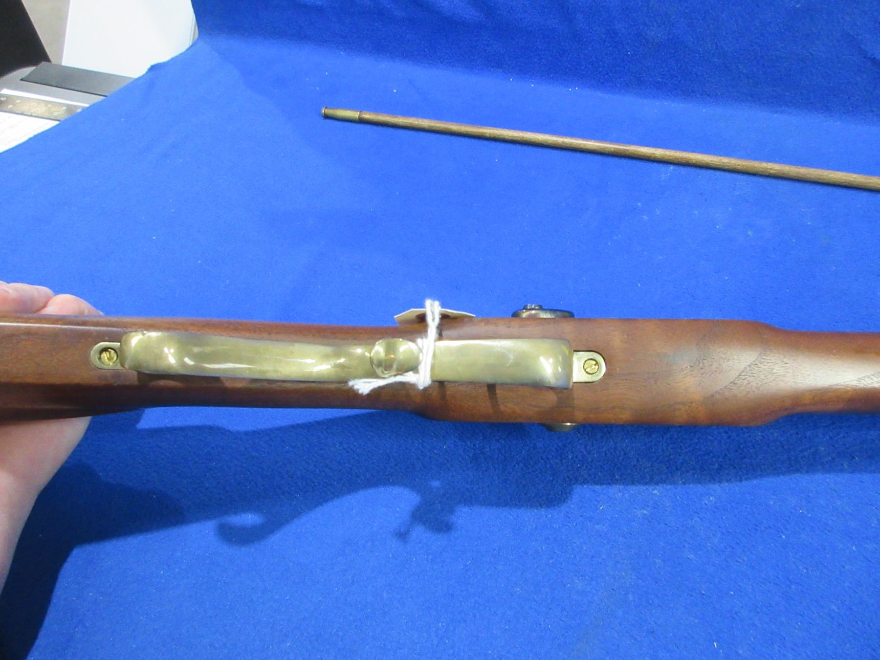 Non-Restricted - Thomson/Center Hawken in 54 Cal. - This muzzleloading percussion cap rifle with double set triggers appears to be in good to very good working order. Case hardened action very good, brass furniture good, octagon barrel is 28", rifling appears good to very good, bluing is good with some light scratches, has both sights, stock is good to very good, brass crescent butt plate good, comes with spare ram rod. Ser # 496409