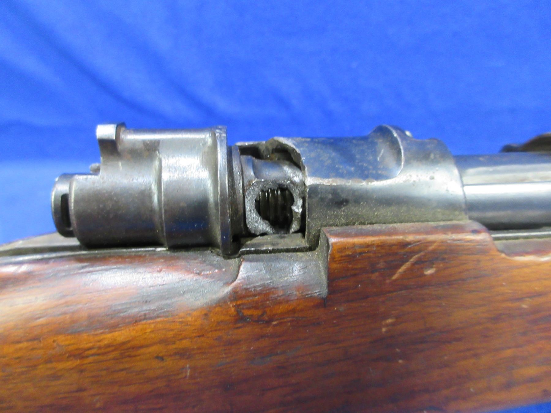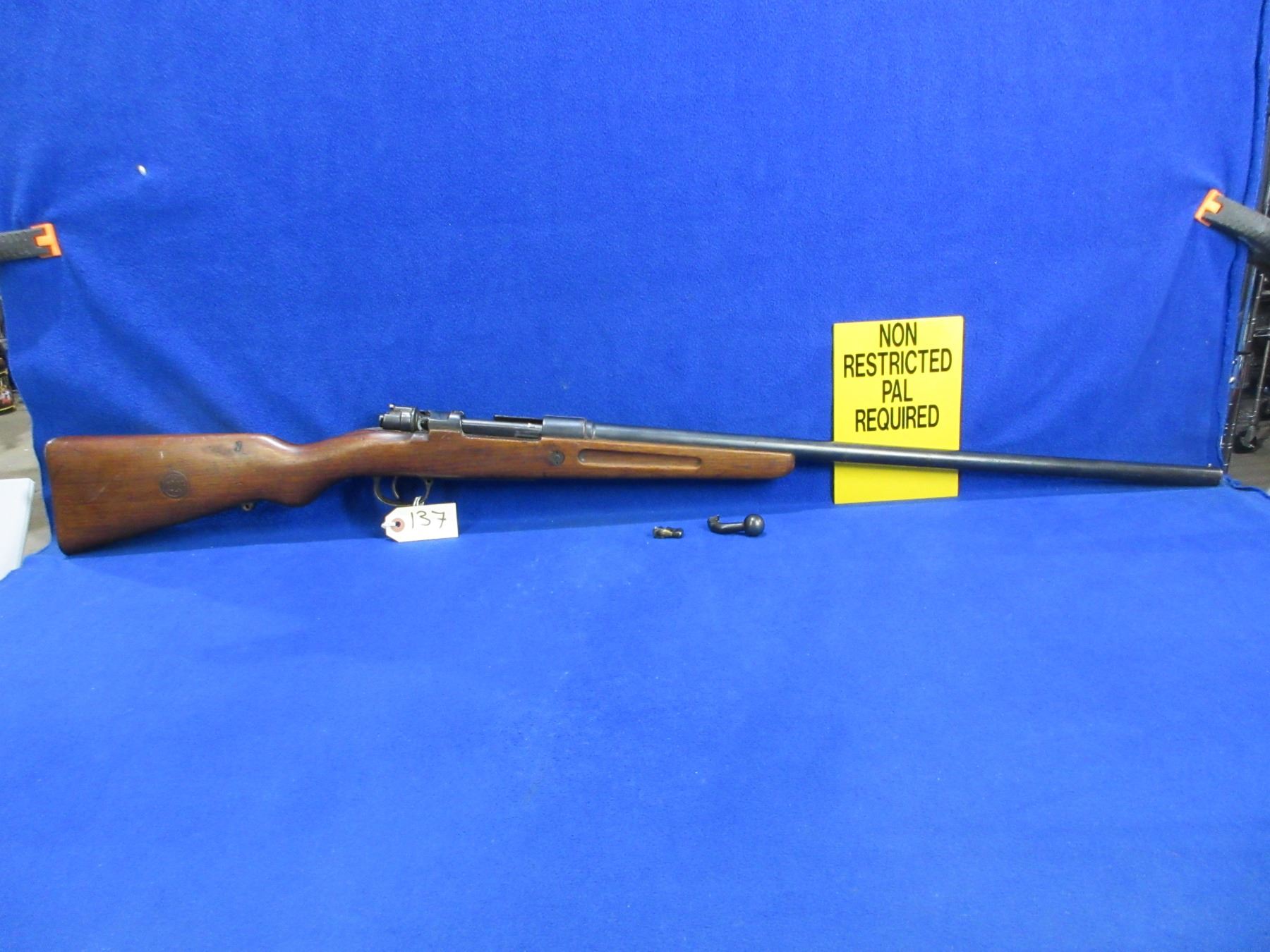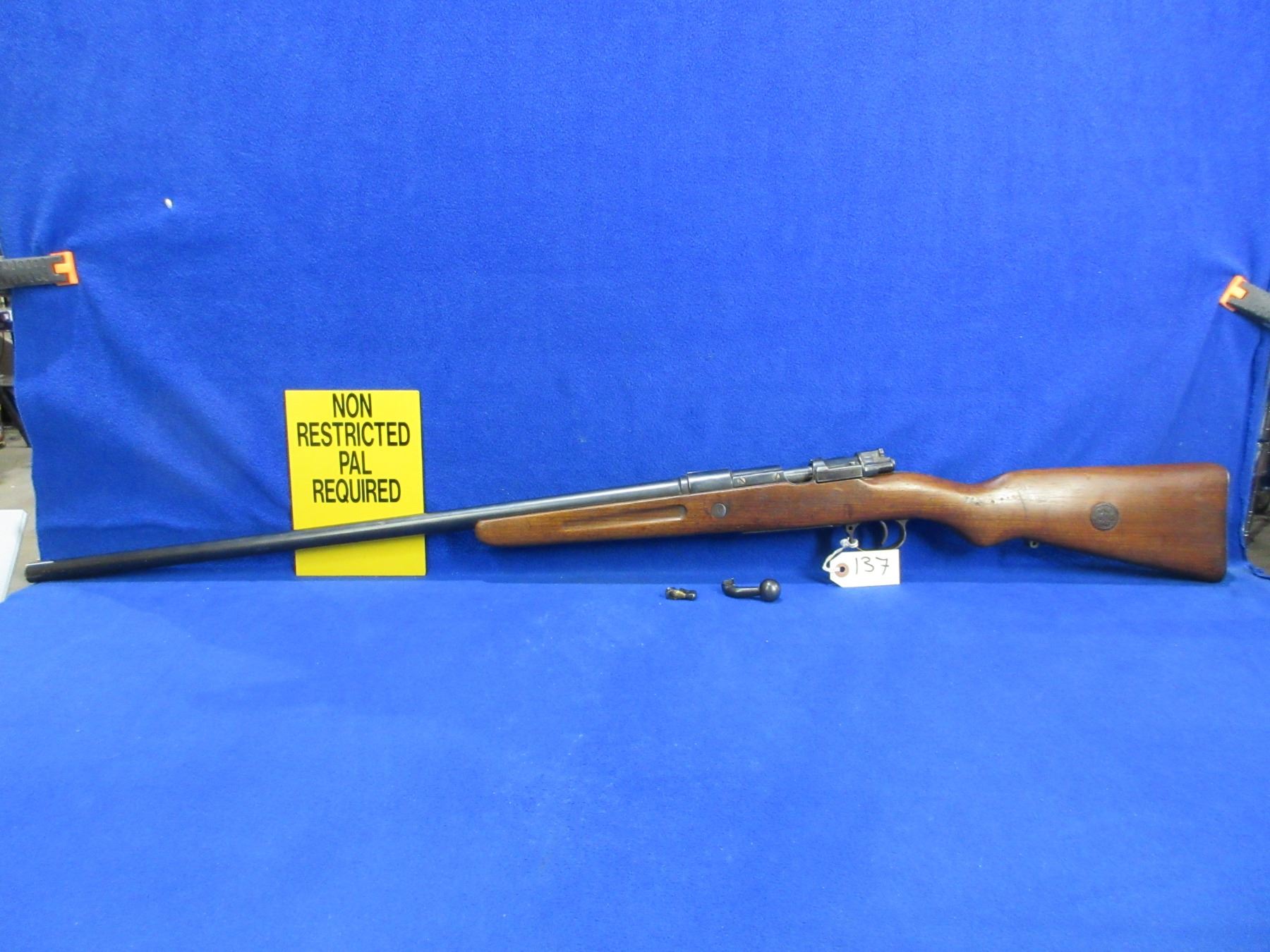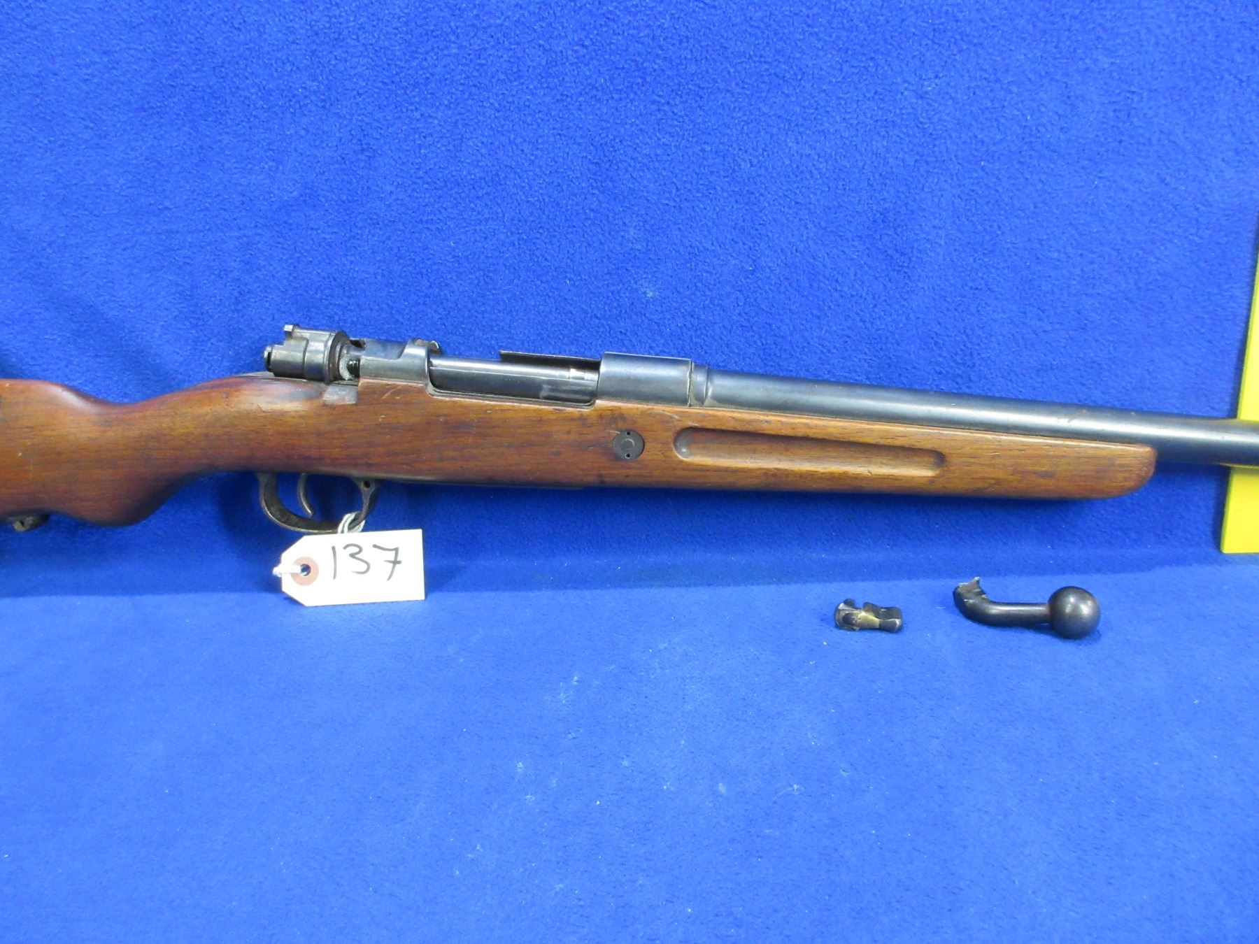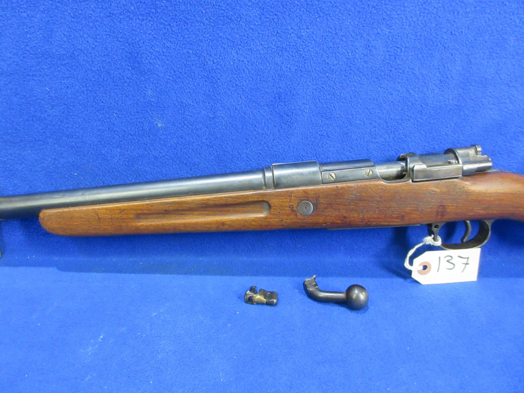 Non-Restricted - Mauser Geha in 12 Ga - This bolt action shotgun with floorplate magazine is a parts gun as bolt handle is broken off and safety is not attached to action. Barrel is 27", bore appears poor (unable to open action), action has been checked and is empty, bluing is good with some pitting, has front bead sight, stock has cracks on top and bottom behind the action, metal butt plate pitted. Ser #7179 on bolt