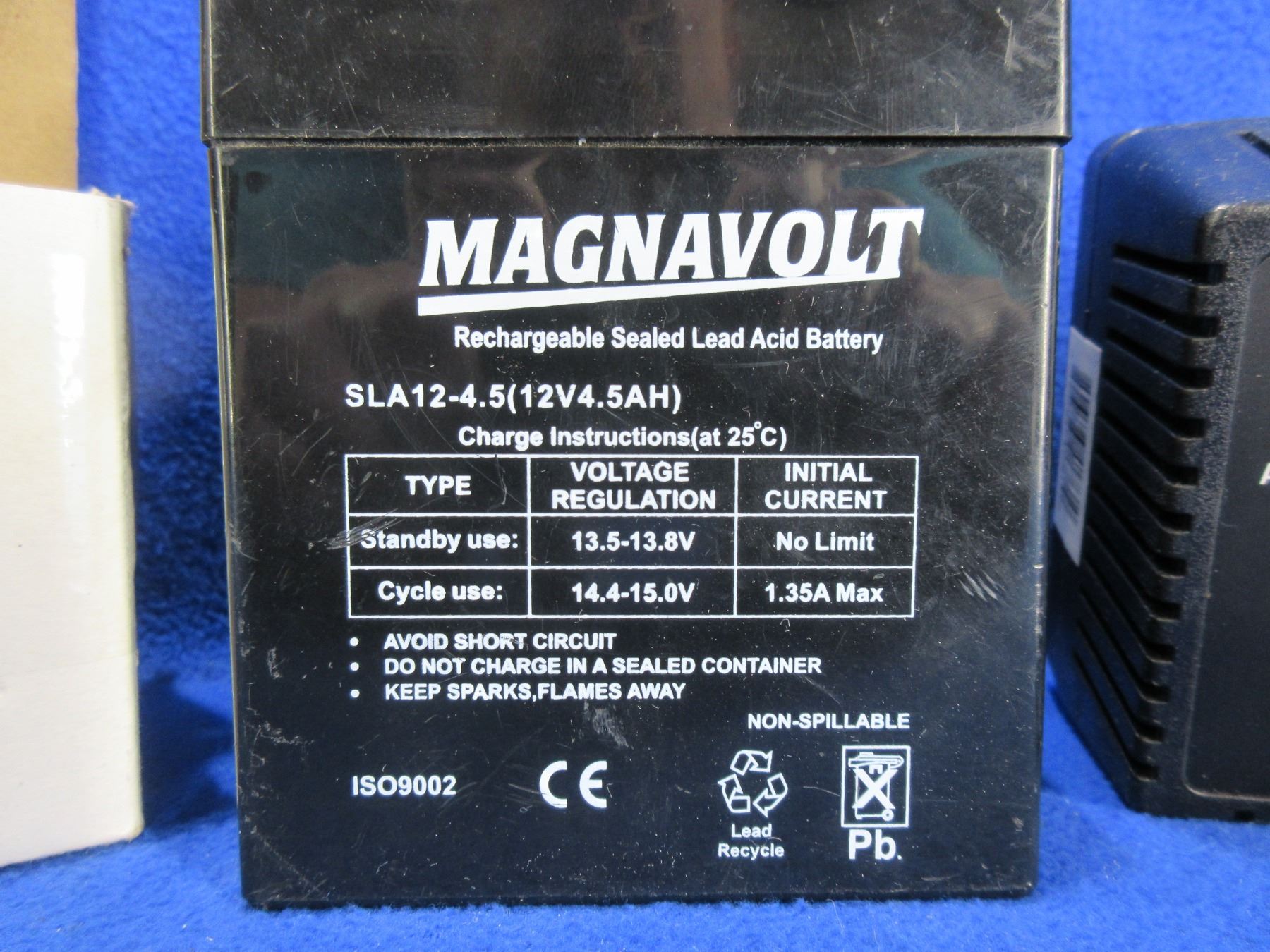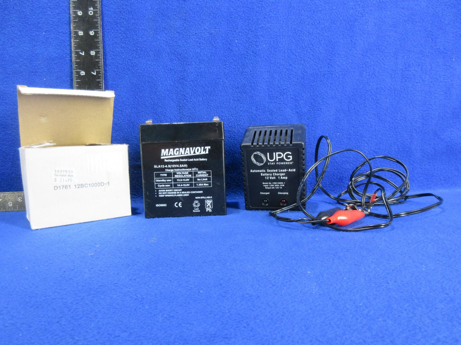 UPG 12 Volt 1 Amp Battery Charger with Magnavolt 12V4.5AH Battery - Tested working at time of cataloging, green light indicating battery was fully charged