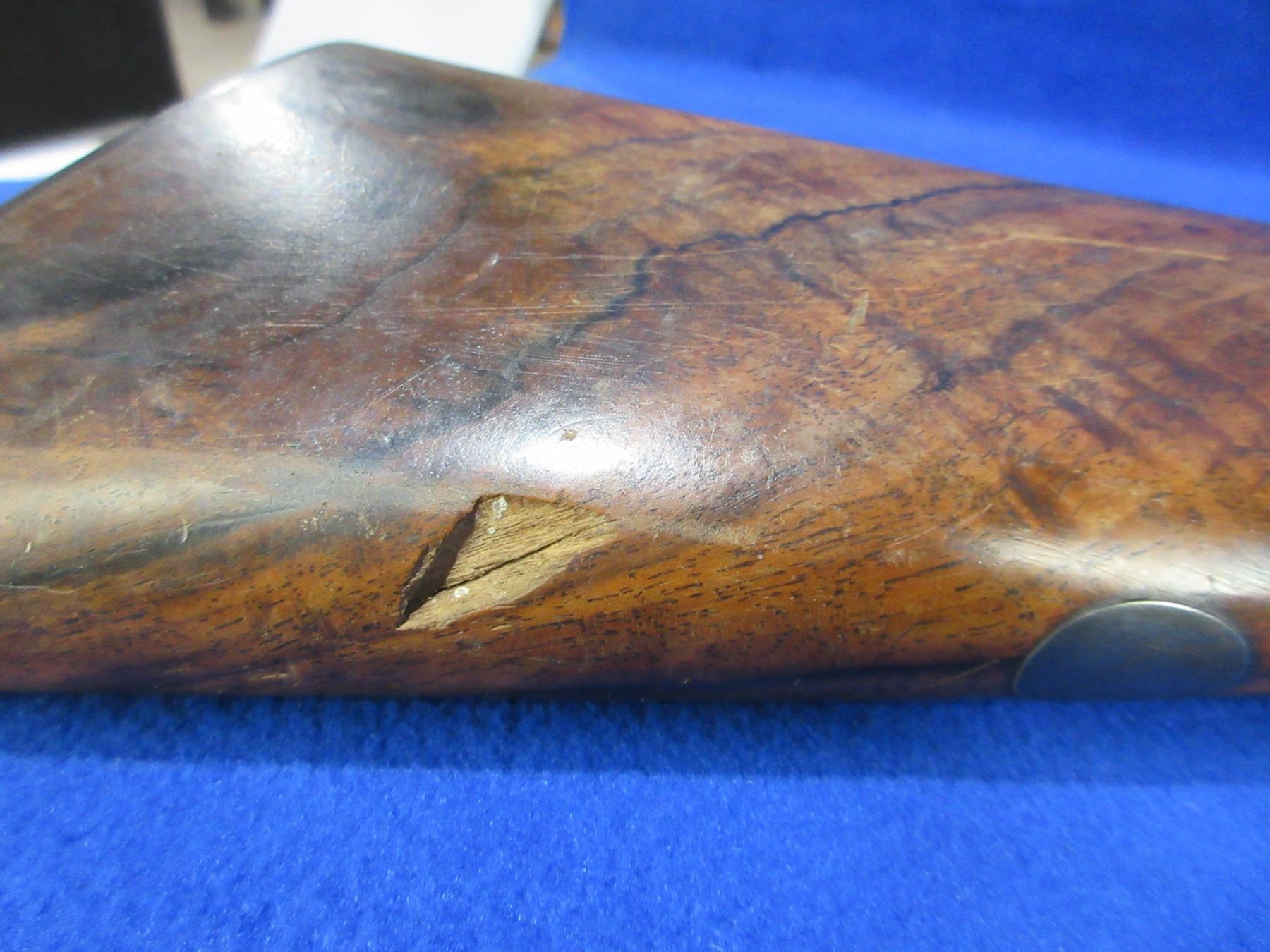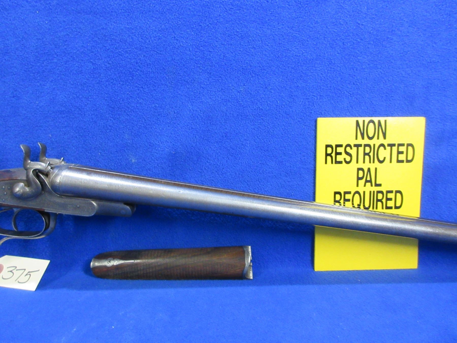Non-Restricted - John Dickson & Sons in 12 Ga. 2 1/2" - This tip up SXS hammer shotgun appears to be in good working order, action is tight. Action is nicely engraved. Damascus barrels are 30", bores are fair to good but right barrel has a dent approx 13" from the muzzle, bluing is mostly gone, has bead front sight, stock is good for age with many usage marks and has a chip approx 3" from toe, forearm is good for age but locking mechanism is not working, butt plate good. Ser # 3260