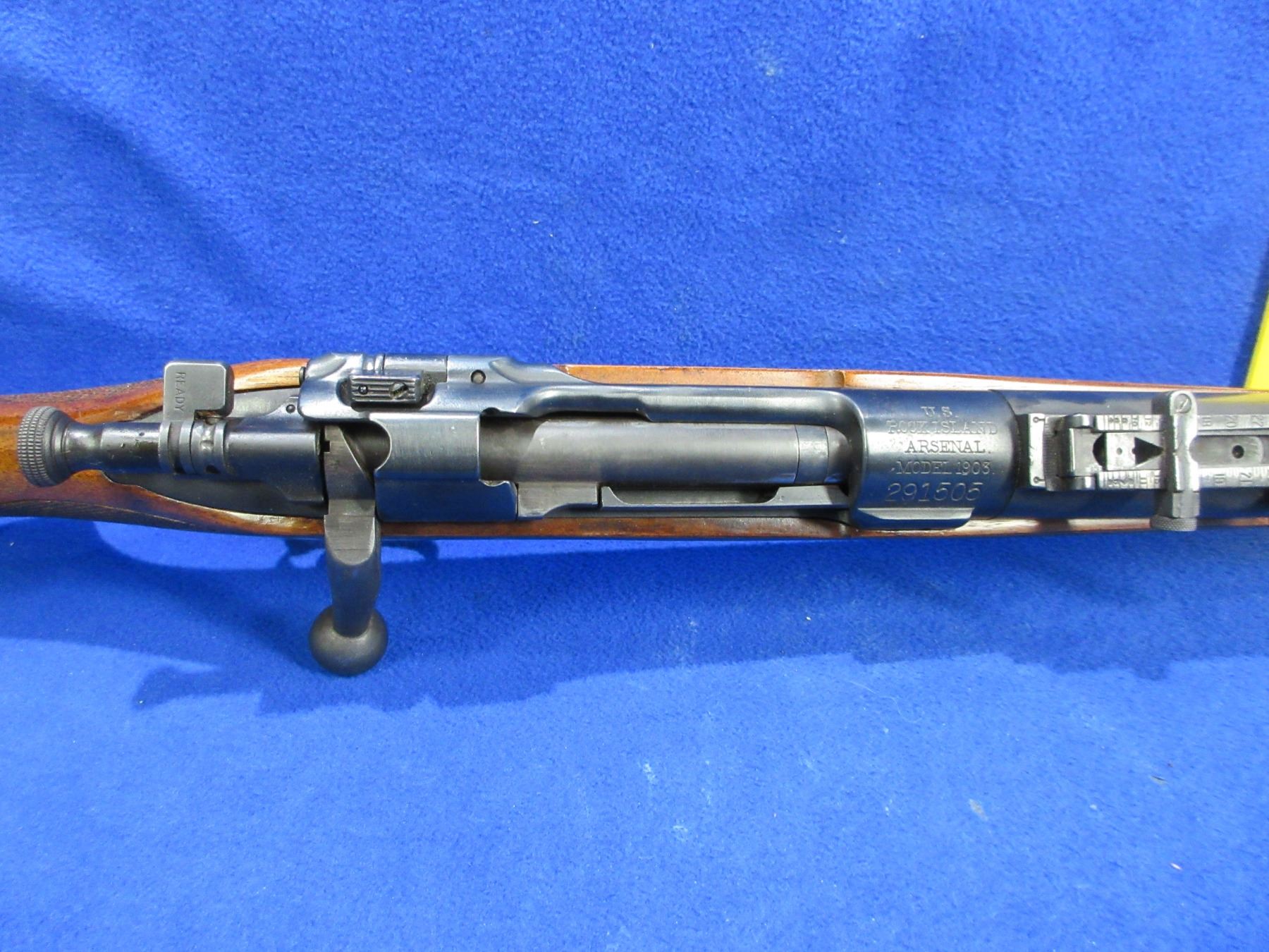 Non-Restricted - Rock Island Arsenal 1903 in 30-06 Sprg - This bolt action rifle with floorplate magazine appears to be in good to very good working order. Barrel is 24", rifling is fair to good (needs wet cleaning), bluing is good with some light pitting, has both sights, stock is good with usage marks, butt plate good, comes with swivels. Ser #291505