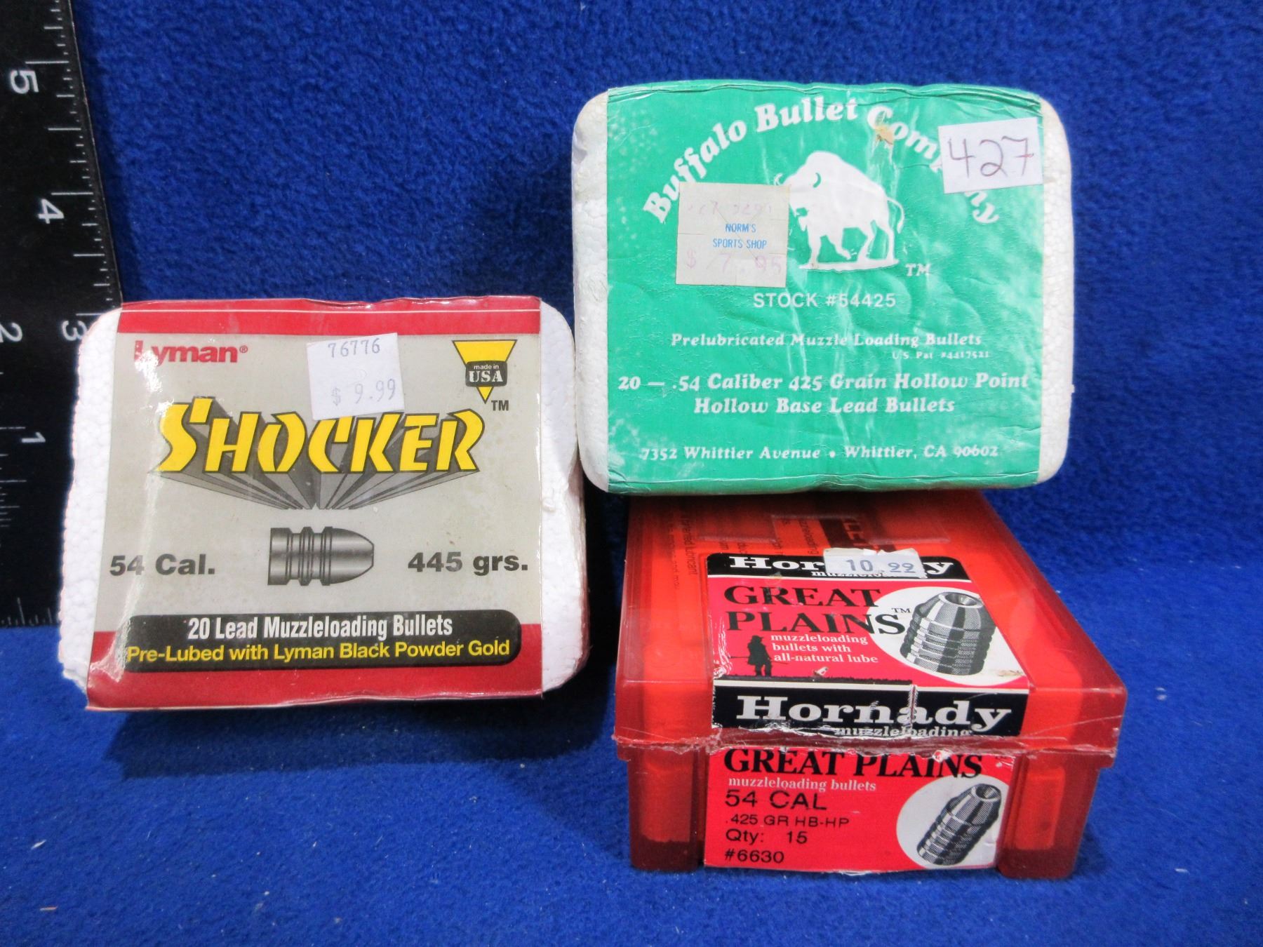 54 Cal. Bullets - Box of 15 (425gr HB HP Hornady), Box of 20 (445gr Lyman Shocker), Box of 19 (425gr HB HP Buffalo Bullet Co.)