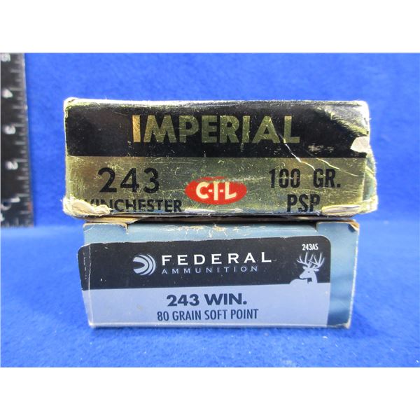 243 Win. Federal and Imperial Cartridges - Box of 17 + 3 Brass (80gr SP Federal), Box of 11 (100gr PSP Imperial) - PICK UP ONLY