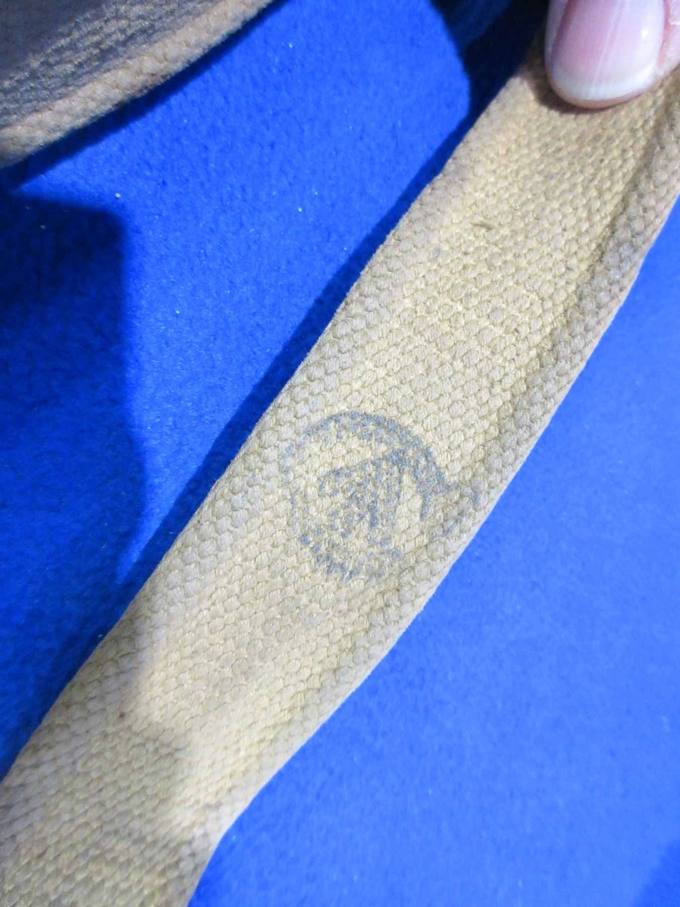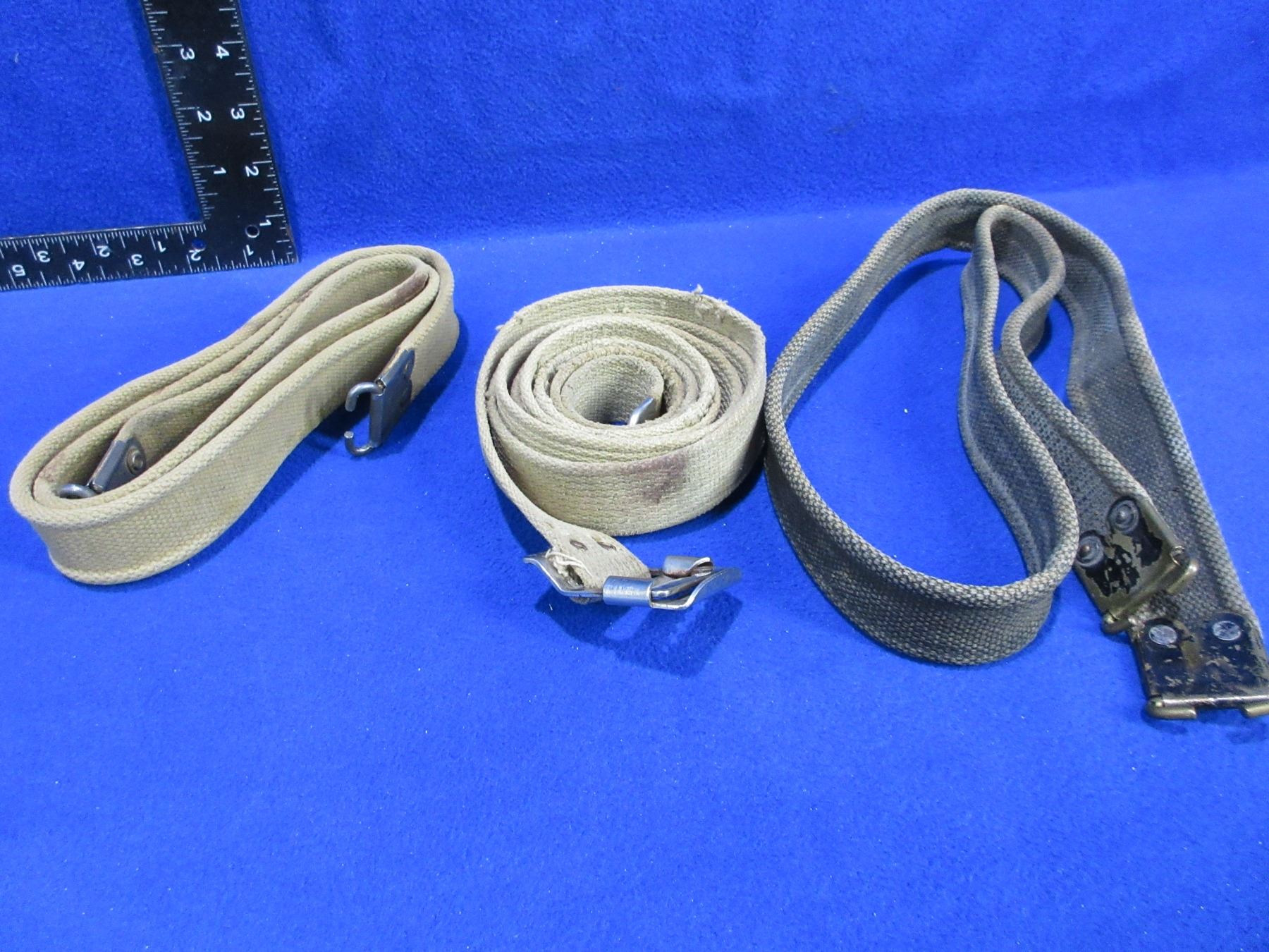 2 Military Web Rifle Slings and 1 Military Web Waist Belt - 1 sling has a broad arrow mark