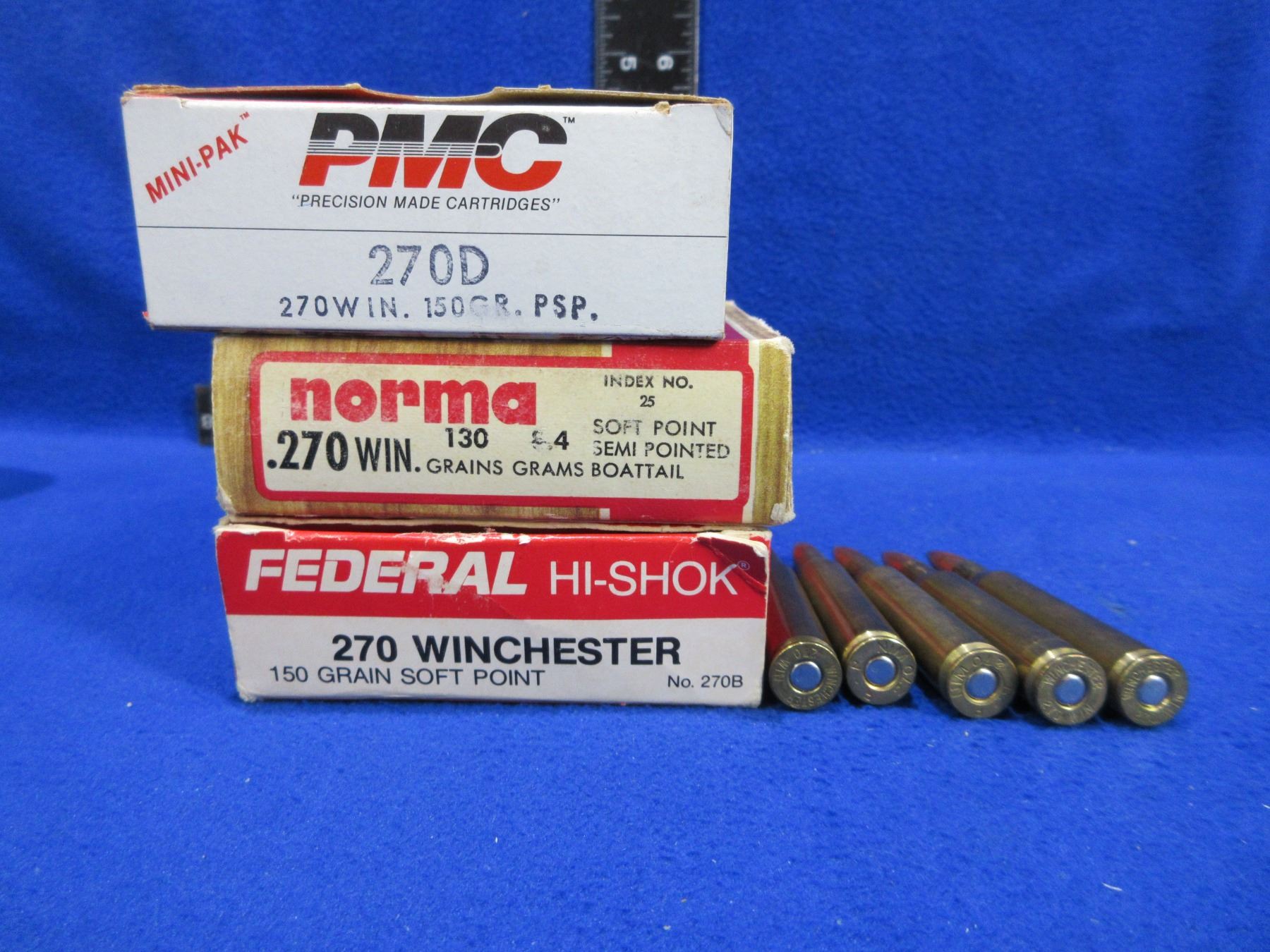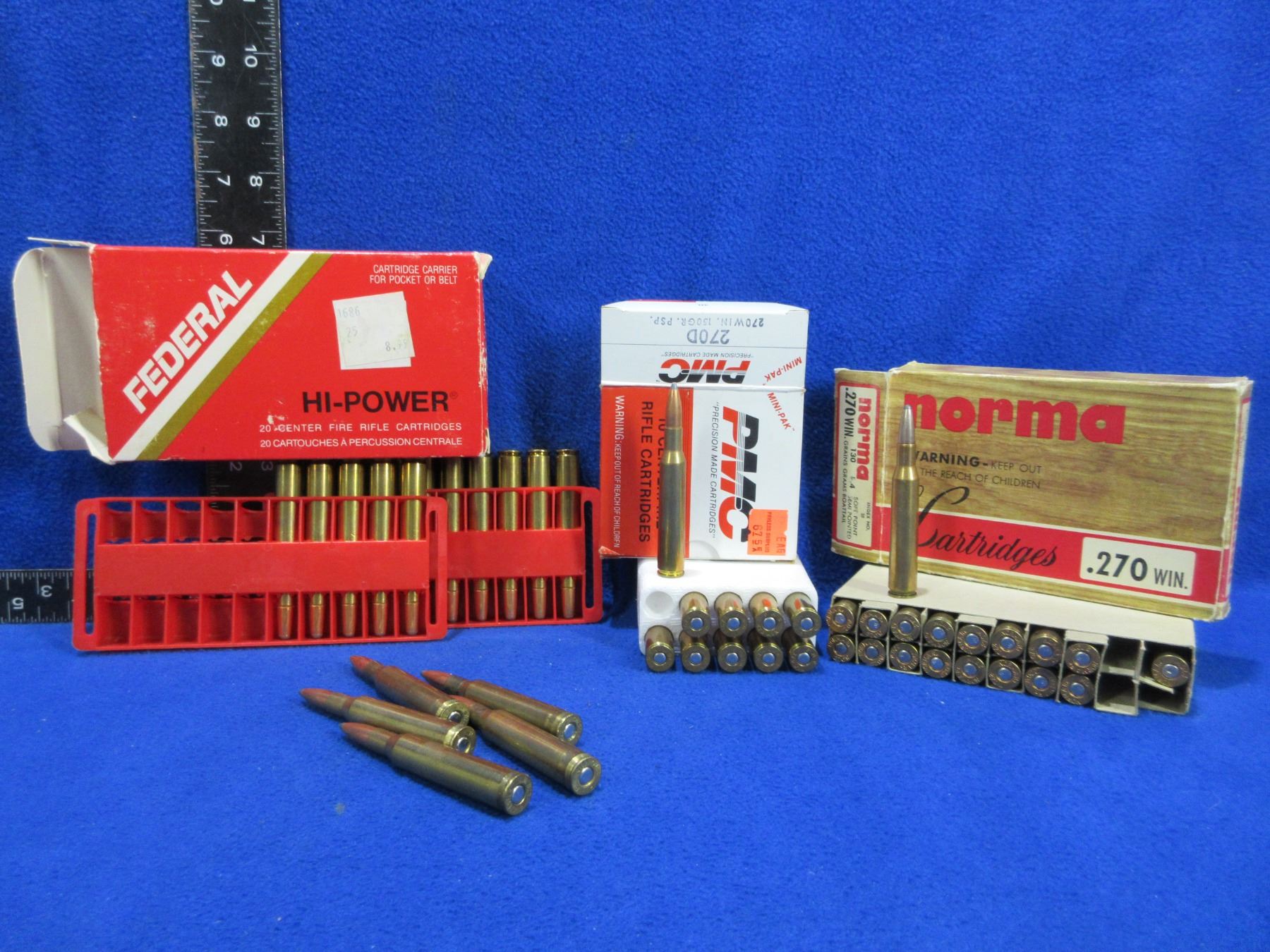 270 Win. Factory and Reloads Cartridges - Box of 15 (Federal 150gr SP), Box of 10 (PMC 150gr PSP), Box of 17 (Norma 130gr SP BT), Bag of 5 (Reloads) - Sold as Components - PICK UP ONLY