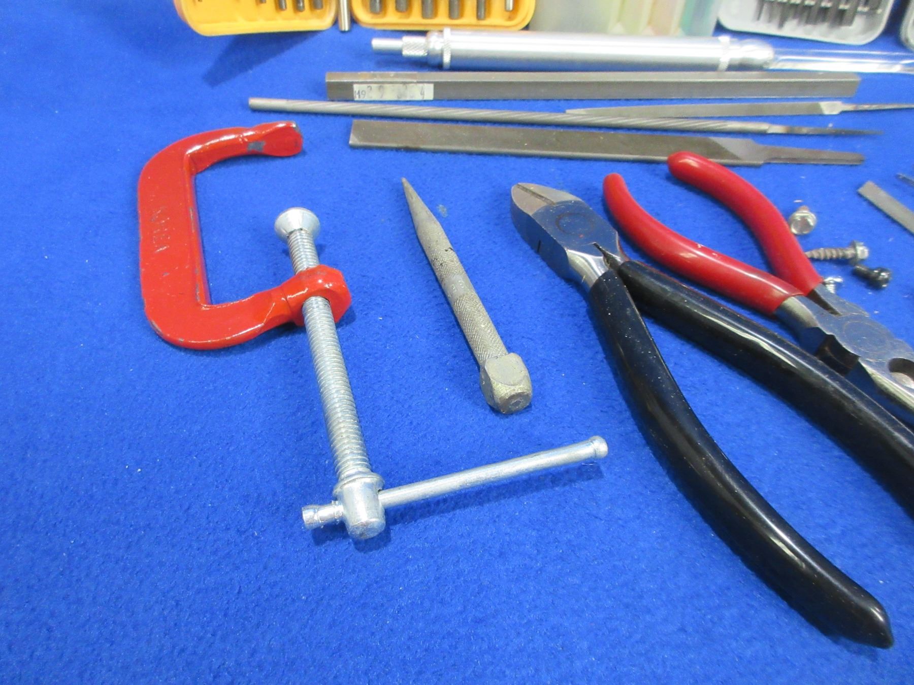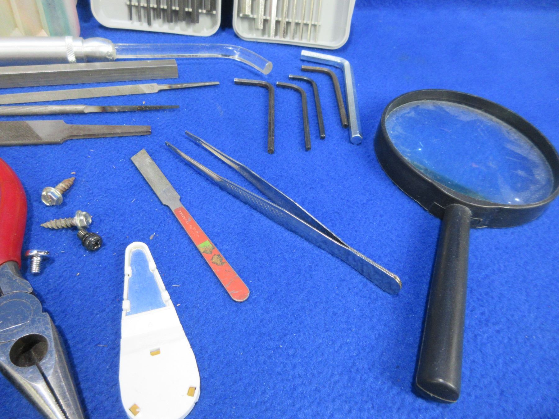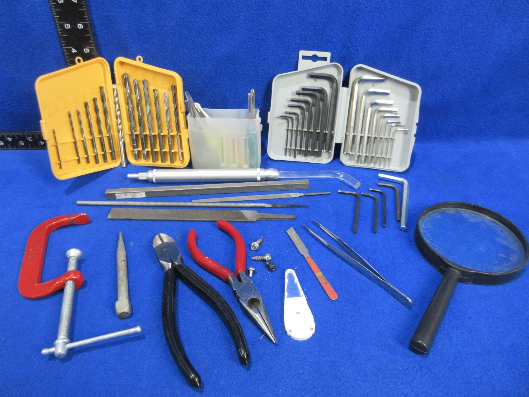 Lot of Misc. Tools - Drill Bits, Allan Keys, Bore Light, Magnifying Glass, Screwdrivers, Pliers, Clamp, Etc.