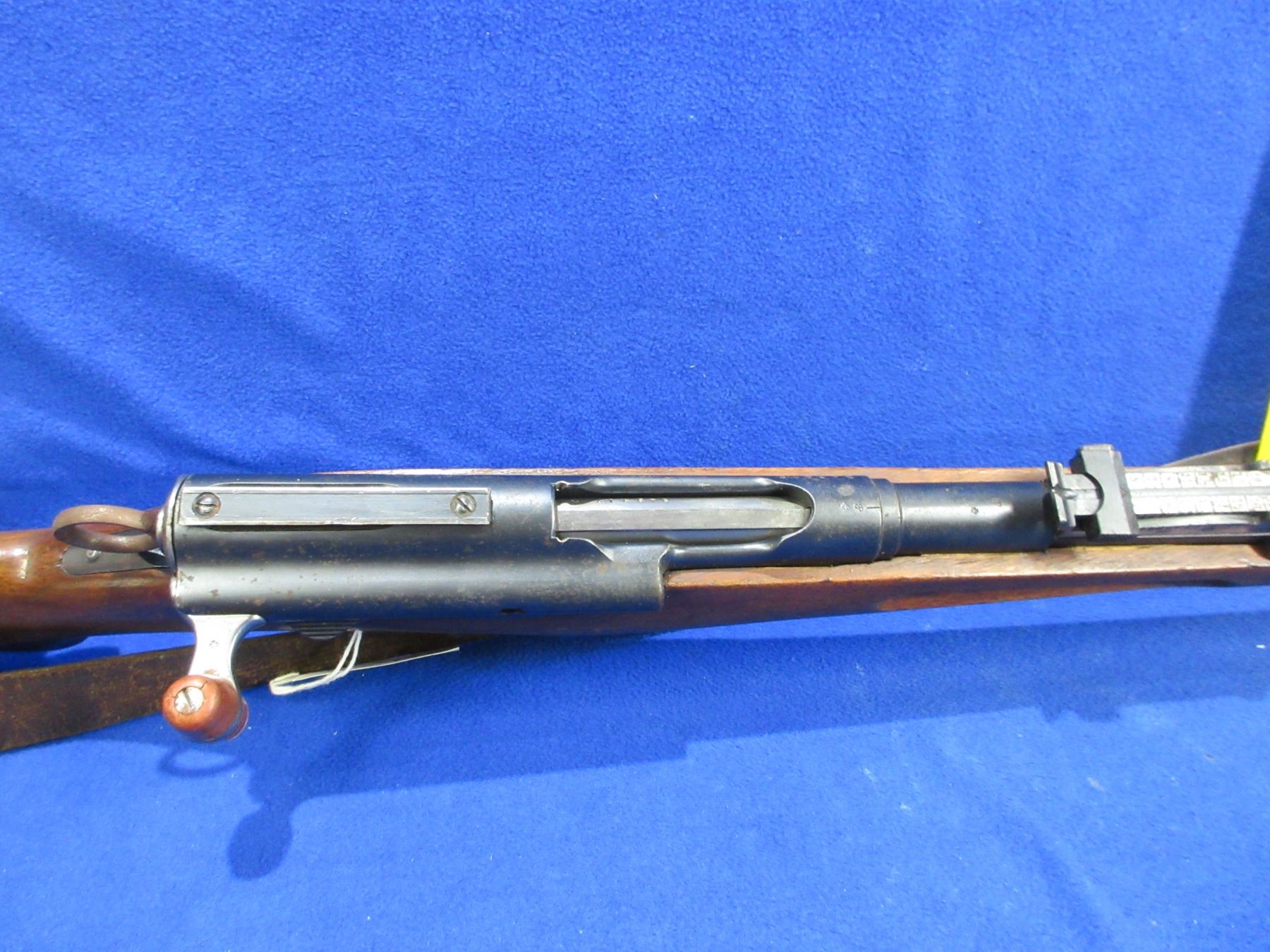 Non-Restricted - Schmidt Rubin Model 1911 in 7.5x55 - This straight pull bolt rifle with removable magazine appears to be in good working order. Barrel is 30 1/2", rifling is good to very good, bluing is good with some light pitting, has rear sight, front sight missing, full wood stock is good for age with many usage marks, metal butt plate good, comes with swivels and sling. Ser #243217