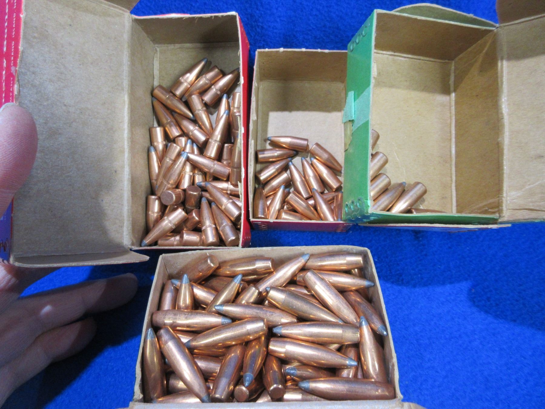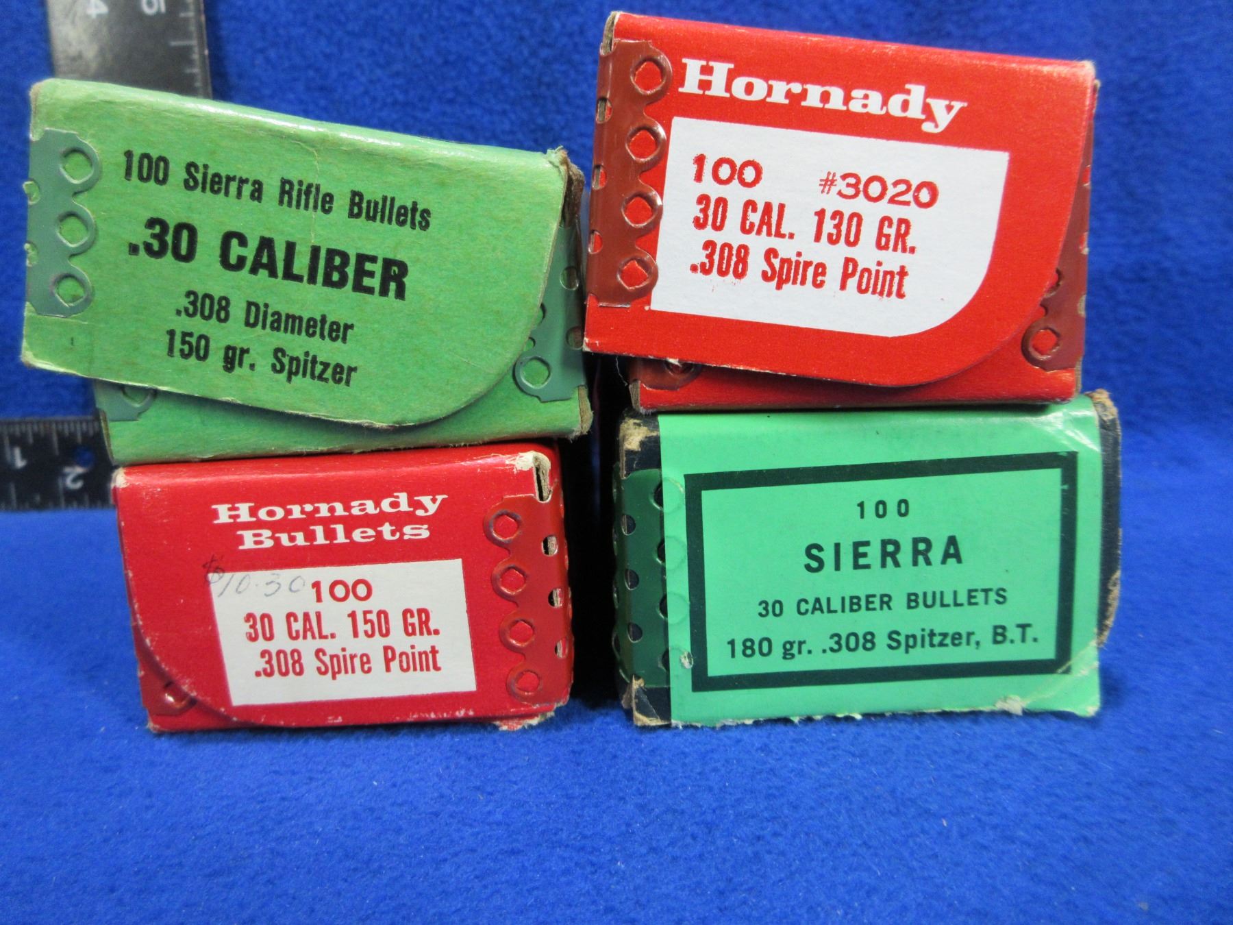 30 Cal. .308" Hornady and Sierra Bullets - Box of 100 (Sierra 180gr Spitzer BT), Box of 6 (Sierra 150gr Spitzer), Box of 19 (Hornady 130gr Spire Point), Box of 46 (Hornady 150gr Spire Point)