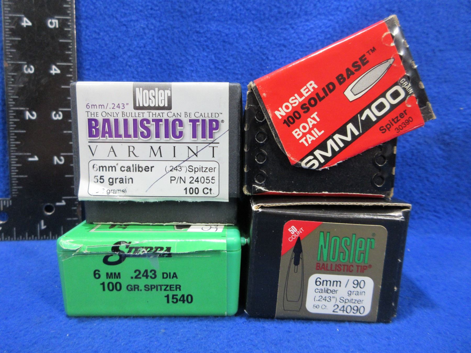 6MM .243" Spitzer Nosler and Sierra Bullets - Box of 100 (Nosler 55gr), Box of 50 (Nosler 90gr), Box of 60 (Nosler 100gr), Box of 90 (Sierra 100gr)