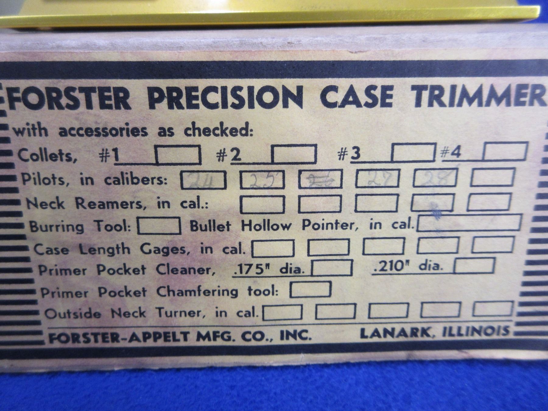 Forster Precision Case Trimmer with 4 Pilots #'s 24, 25, 28, 30