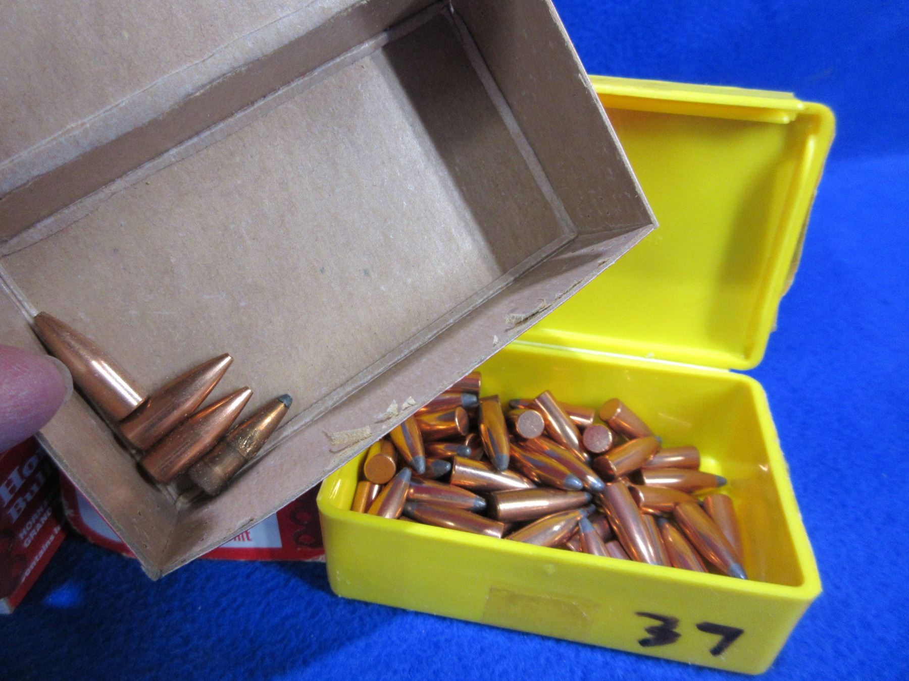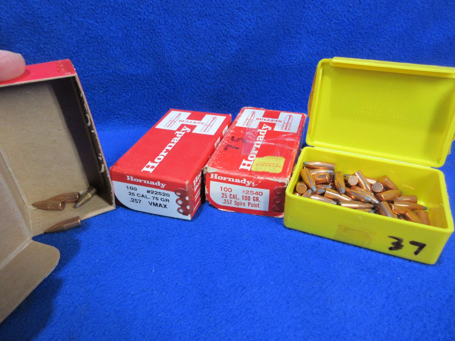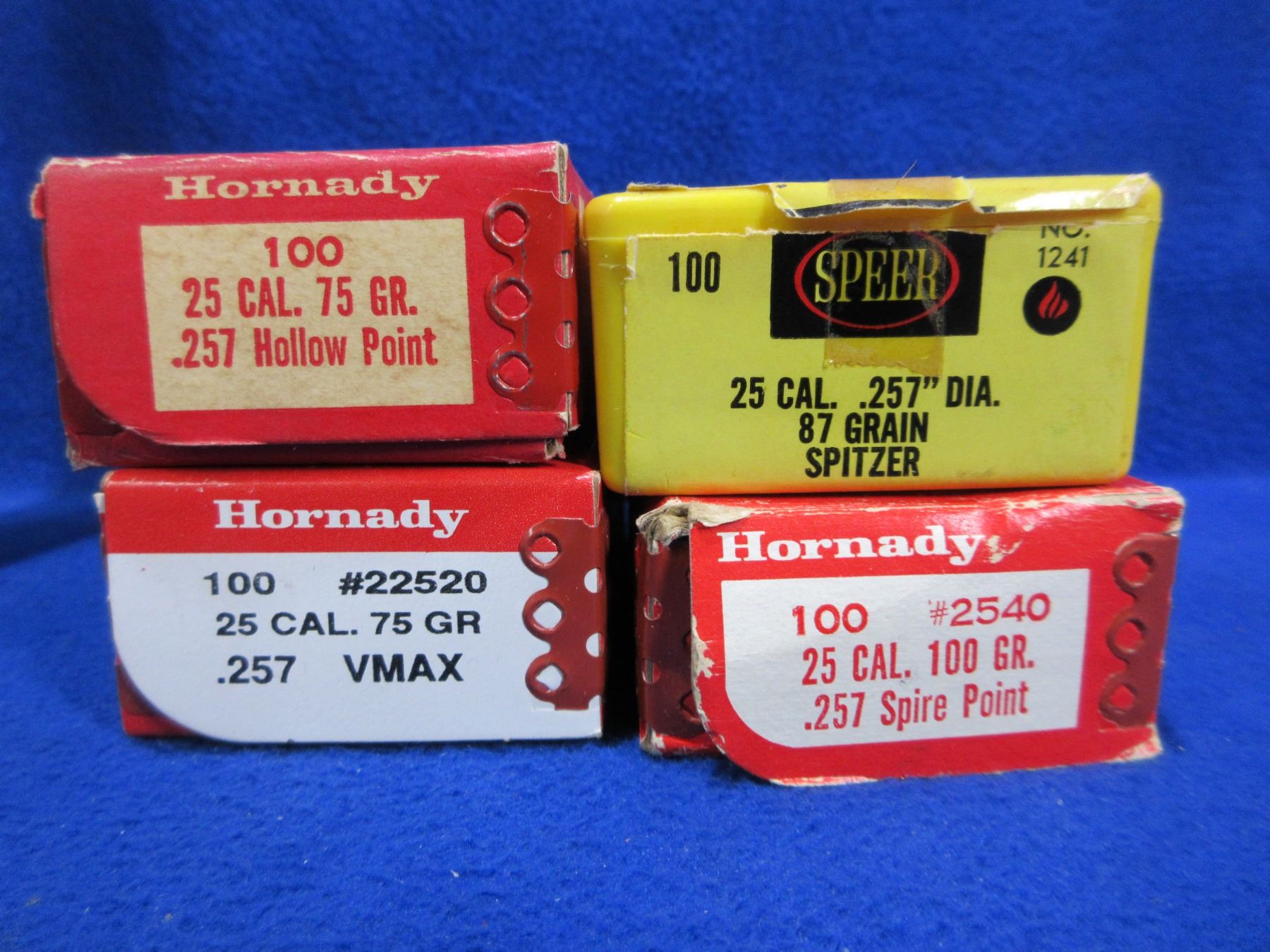 25 Cal. .257" Hornady and Speer Bullets - Box of 75 (Hornady 100gr Spire Point), Sealed Box of 100 (Hornady 75gr VMAX), Box of 4 (Hornady 75gr HP), Box of 56 (Speer 87gr Spitzer)