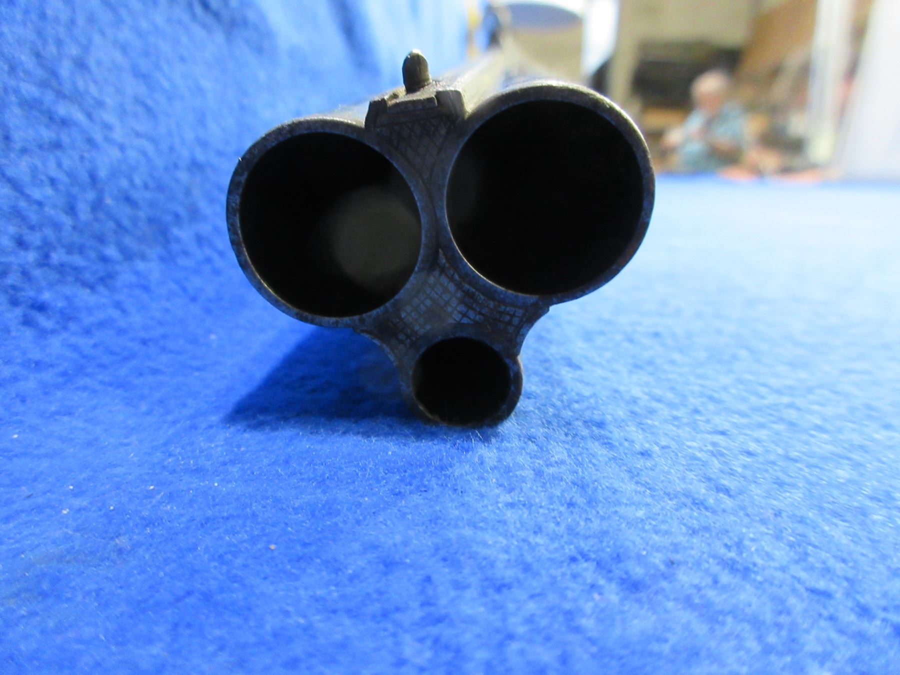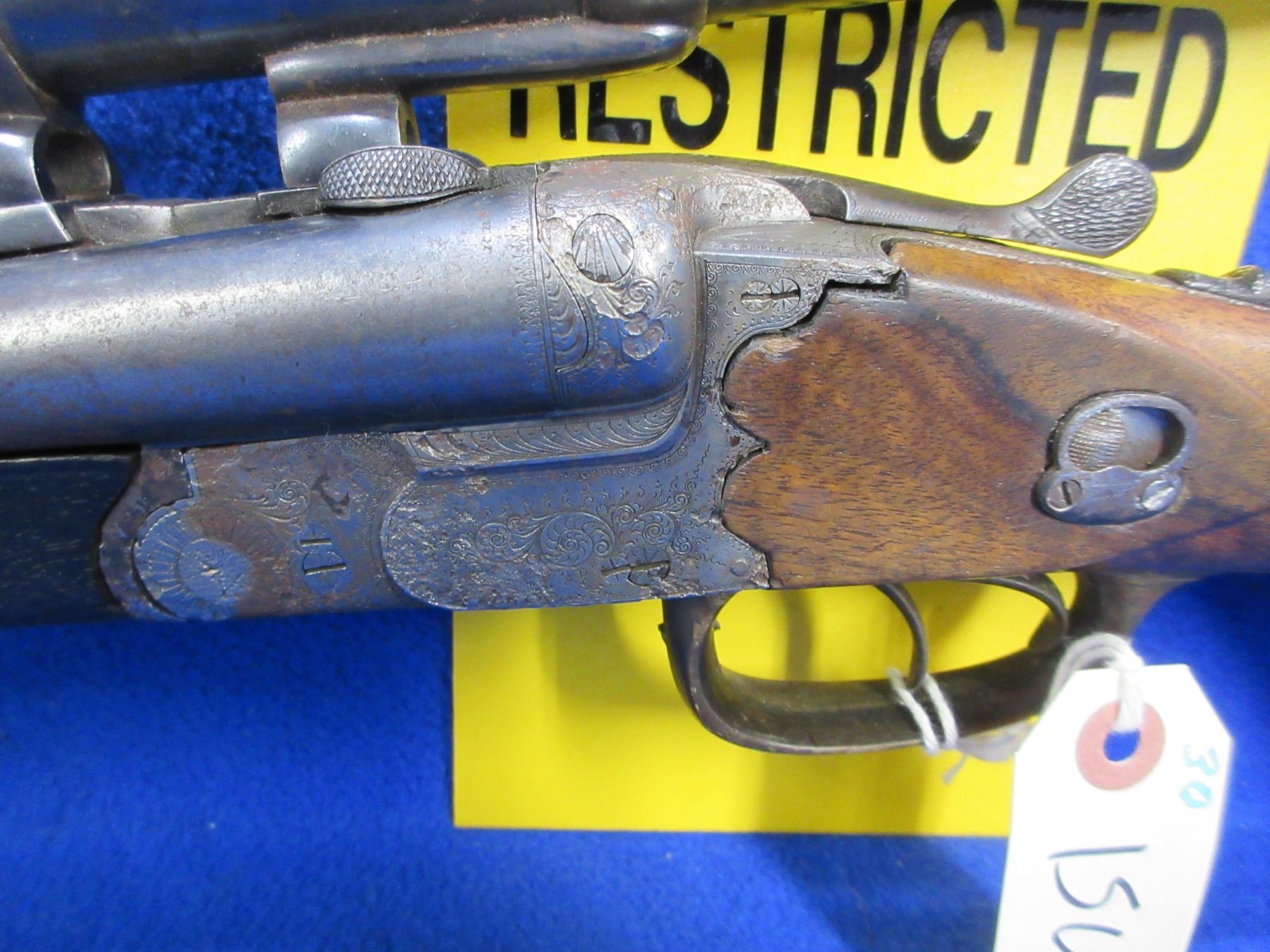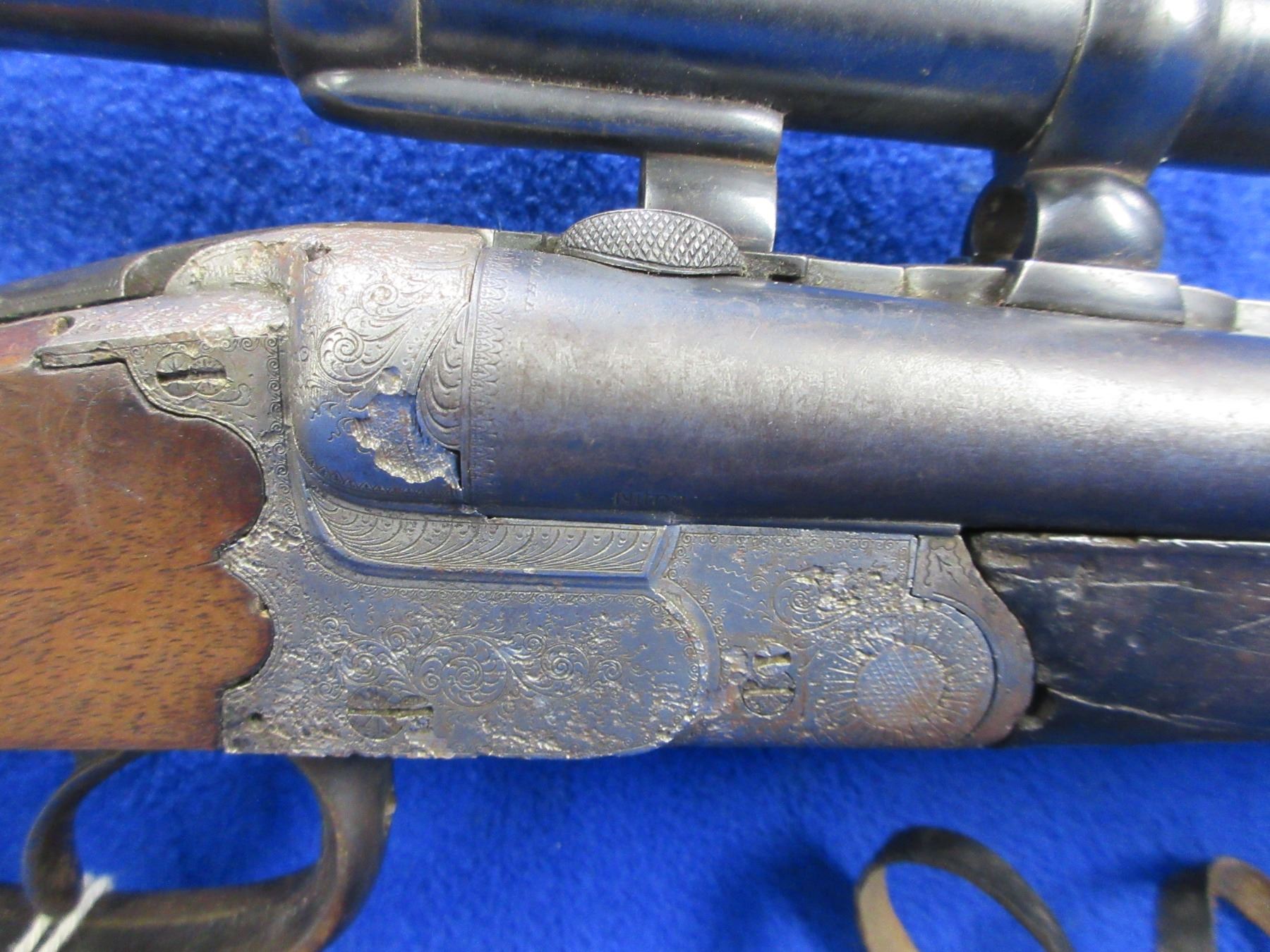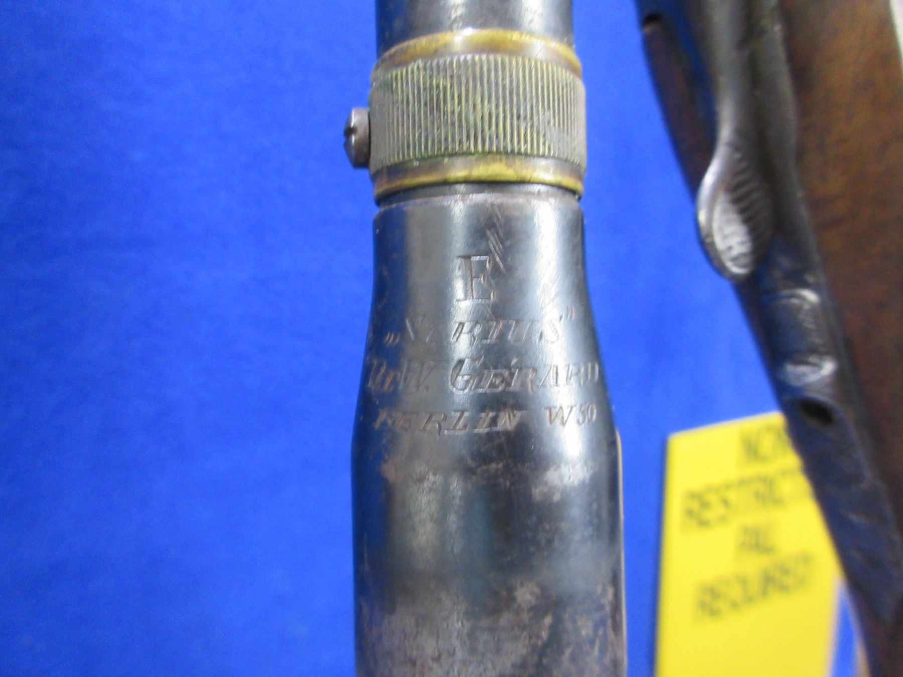 Non-Restricted - Franz Kettner Drilling 16 Ga. 2 1/2"/9.3x72 - This tip up combo shotgun/rifle appears to be in working order. 16 Ga. barrels are 26 3/4" - bores are good but dark, rifle barrel is 26 3/4" - rifling is good but dark, bluing is good with light pitting, engraved action is pitted, has both sights and vintage ca. 1920's "Sirius" Dr. W. Gerard Berlin W50 scope with leather lens covers - appears a bit cloudy but good for age, post reticle. Stock is good with usage marks, forearm is cracked in two places, butt plate has some chips aroung the heel screw. Ser # 19856 on barrel, action Ser#1905.