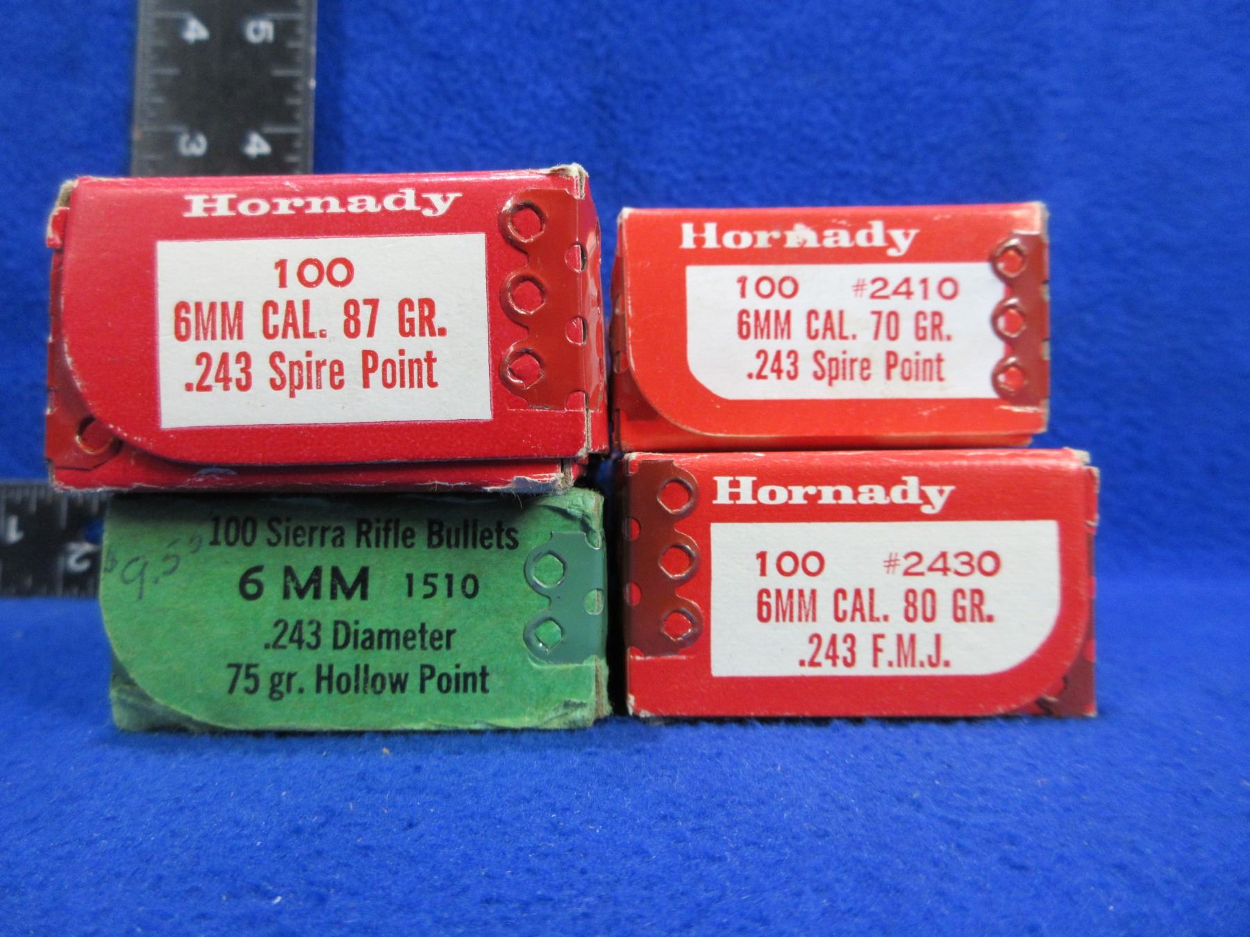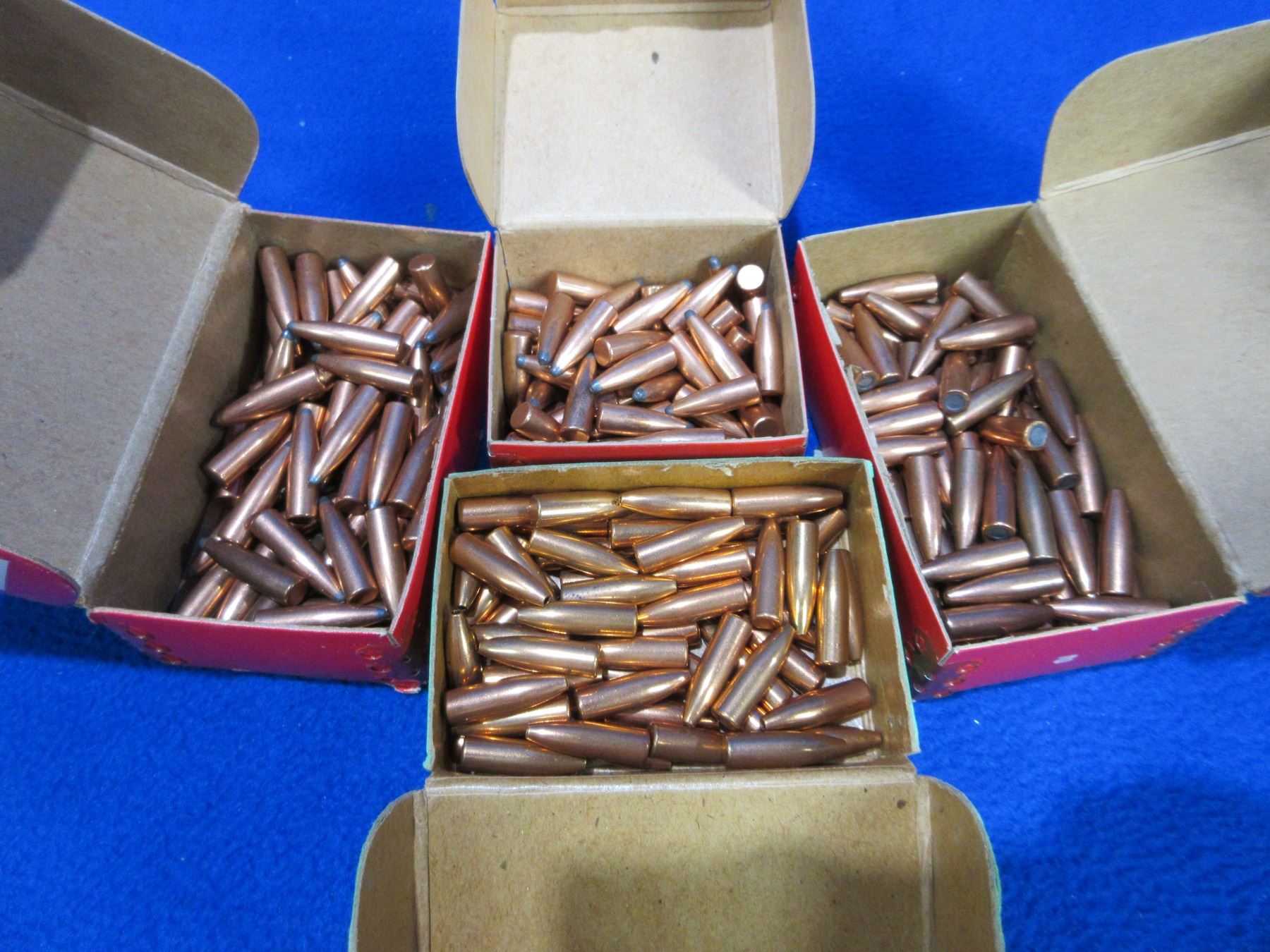 6MM .243" Hornady and Sierra Bullets - Box of 63 (Hornady 70gr Spire Point), Box of 60 (Hornady 87gr Spire Point), Box of 60 (Hornady 80gr FMJ), Box of 56 (Sierra 75gr HP)