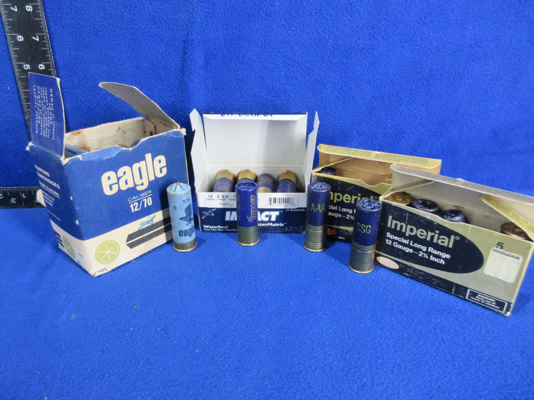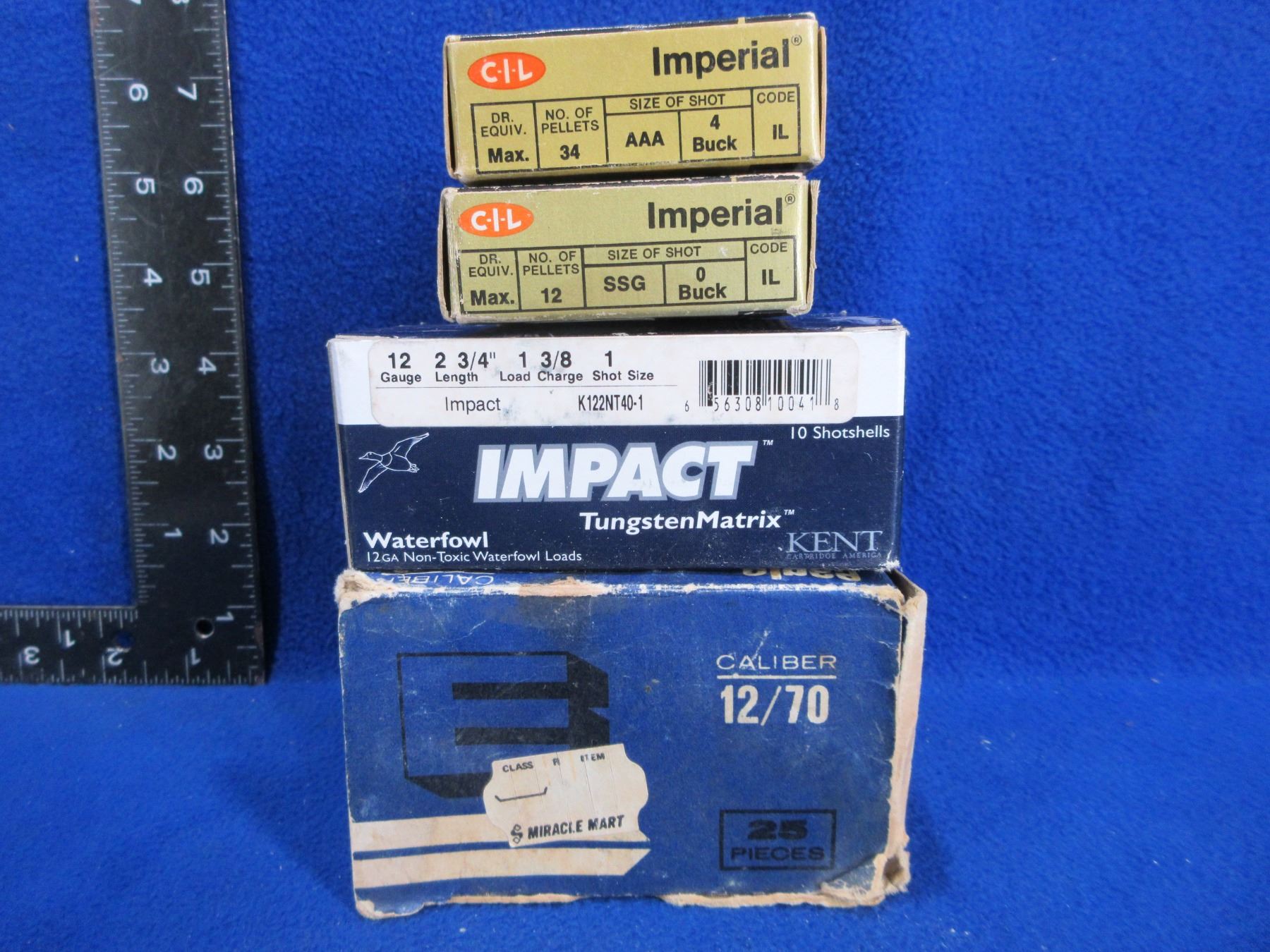 12 Ga. 2 3/4" Assorted Shotshells - Box of 22 (Eagle 6 Shot Paper), Box of 10 (Kent Impact 1 Shot), Box of 2 (Imperial 4 Buck), Box of 5 (Imperial 0 Buck) - PICK UP ONLY