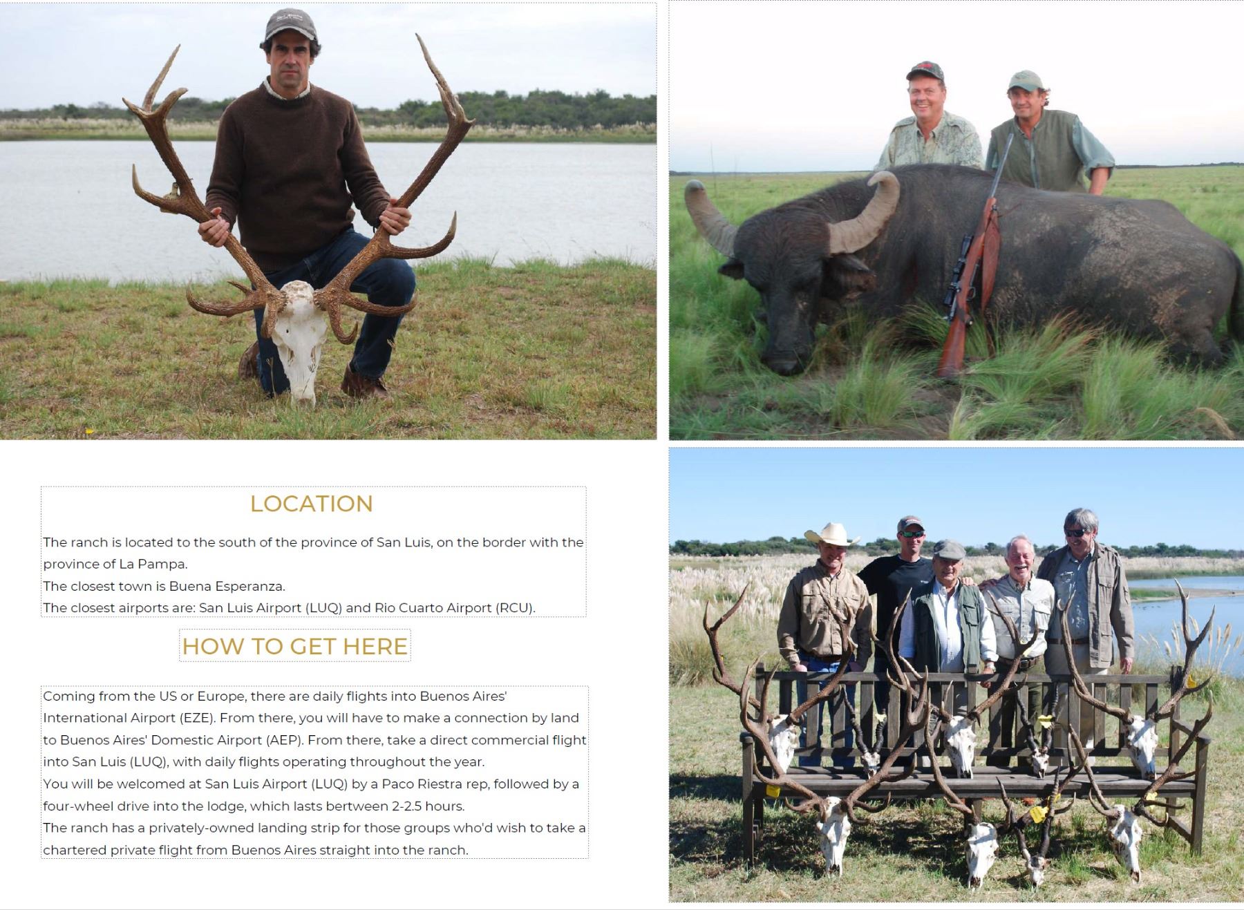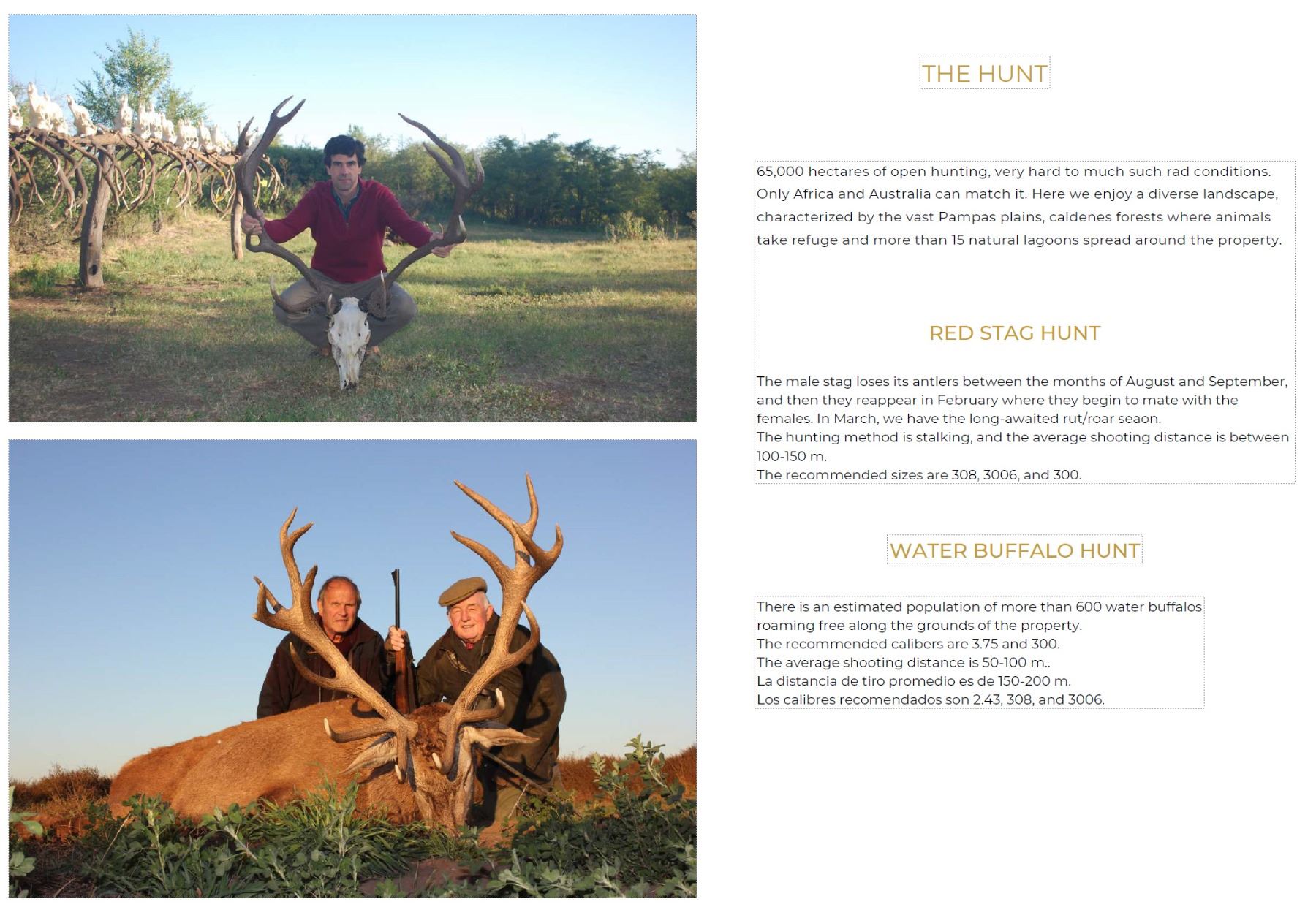Argentina Free Range Red Stag Hunt for one hunter 5 days. This all-inclusive 1 on 1 guided hunt includes the trophy fee for one red stag. Paco Reistra has 165,000 acres of exclusive private hunting grounds. On these grounds there are NO high fences and there are 5,000+ red stags and 600+ water buffalo roaming free. There is no limit on the size of your stag. In addition to the trophy fee of one red stag, all meals, drinks, lodging and 1 on 1 guiding are included. Not included: Gun rental-$350 per hunter, bullets $150 per hunter, license $500 per hunter, transfer from airport to lodge $300 per hunter round trip, tips. Some additional game that can be added: water buffalo, Russian boar, blackbuck and wingshooting for doves and pigeon. The roar of the red stags is from March through about April 15th. This hunt can be taken in either 2025 or 2026. Can add Water Buffalo, Russian Boar or Doves at brochure prices. Value $7500 www.pacoriestra.com