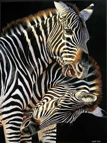 She paints in oil, acrylic and scratchboard, and makes glass mosaics and mixed media sculpture.